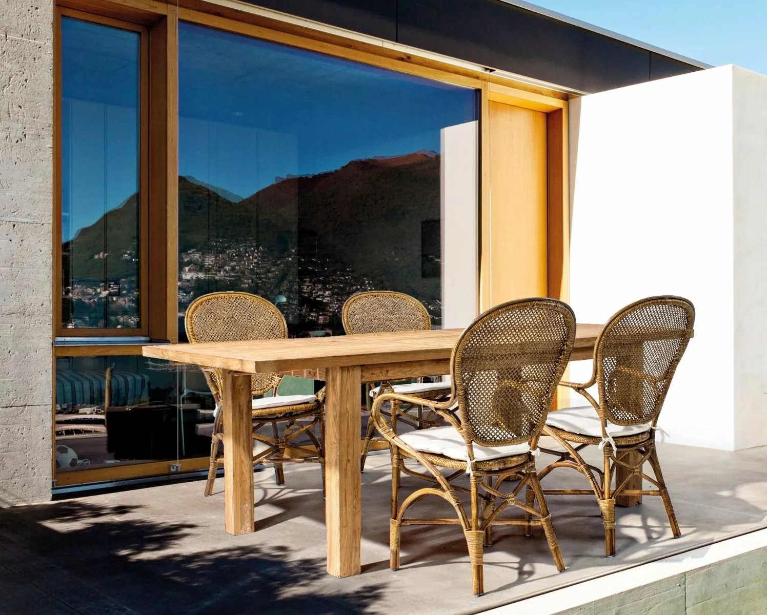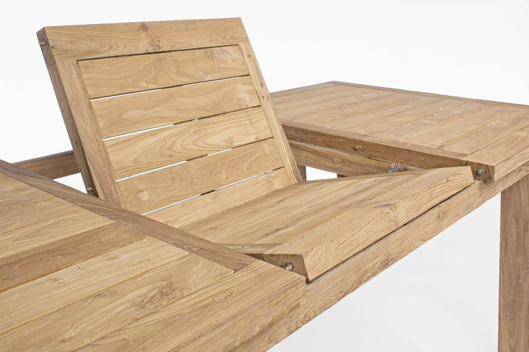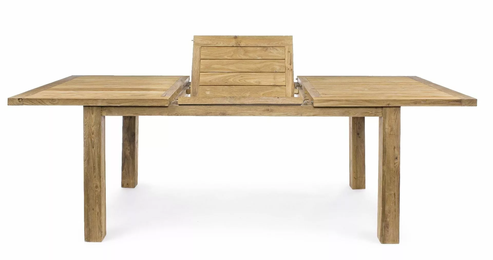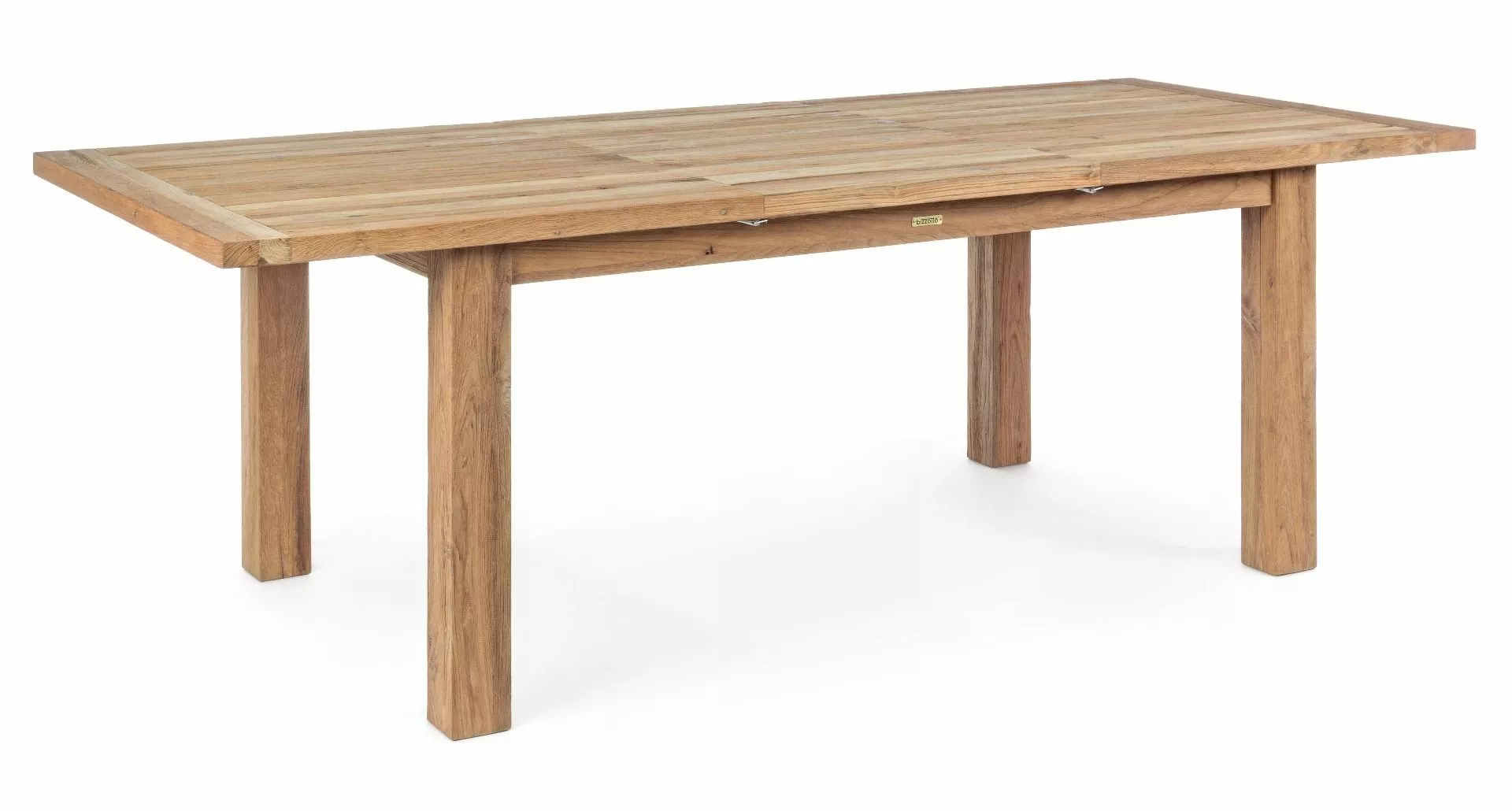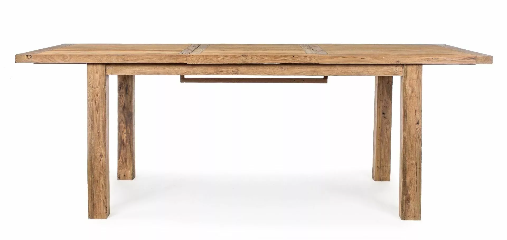 Resirkulert teak, rustikk etterbehandling. tykkelse topp 4 cm, ben 8,5×8,5 cm. skruer i rustfritt stål. rullestenger i aluminium. sommerfugl sentral forlengelse. gjenbruket tre er preget av tilstedeværelsen av tre dybler av forskjellige arter og farger. noen splittelser, sprekker eller ufullkommenheter, som også kan generere over tid, er trekk ved dette materialet og gjør hvert stykke unikt og originalt.