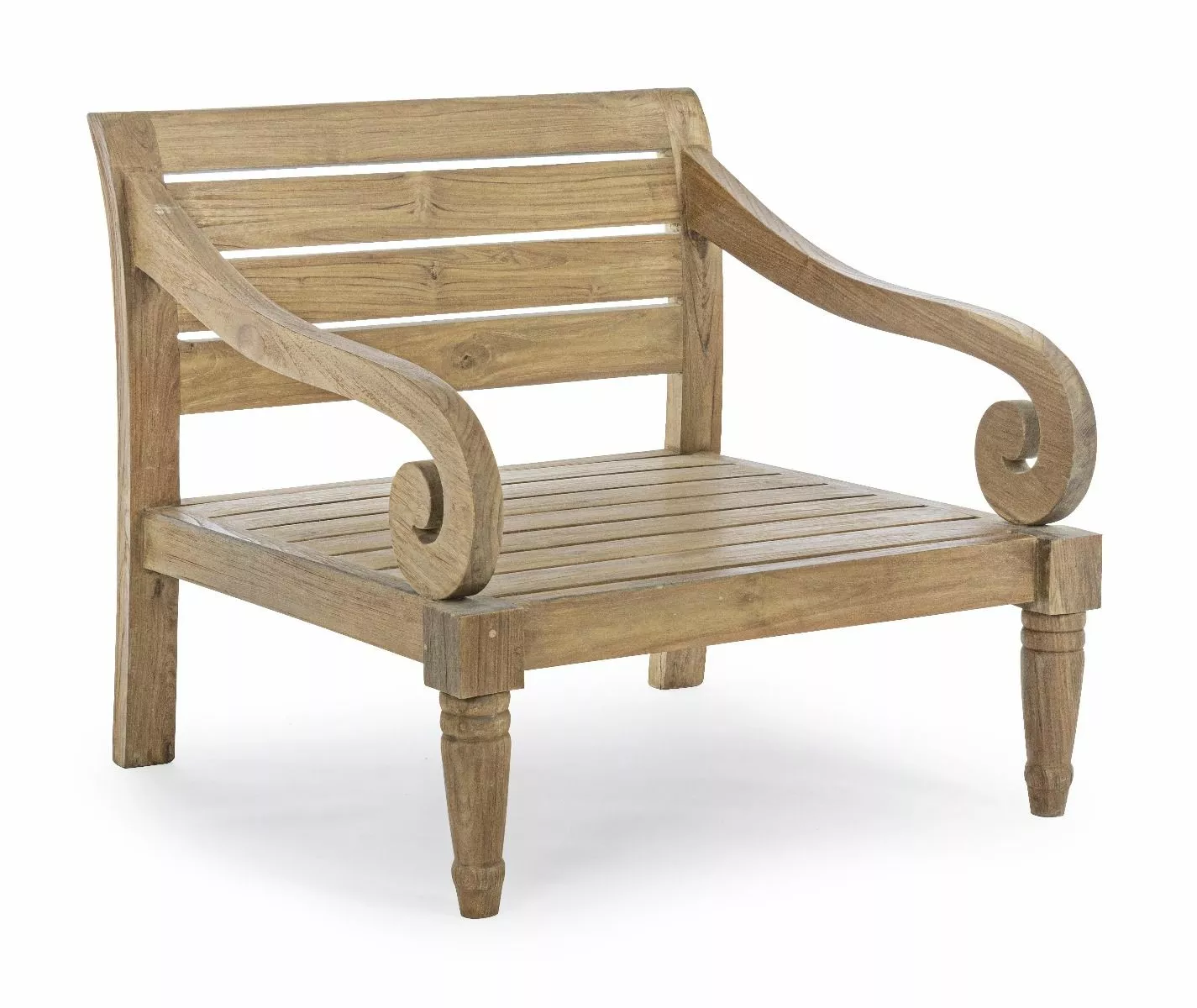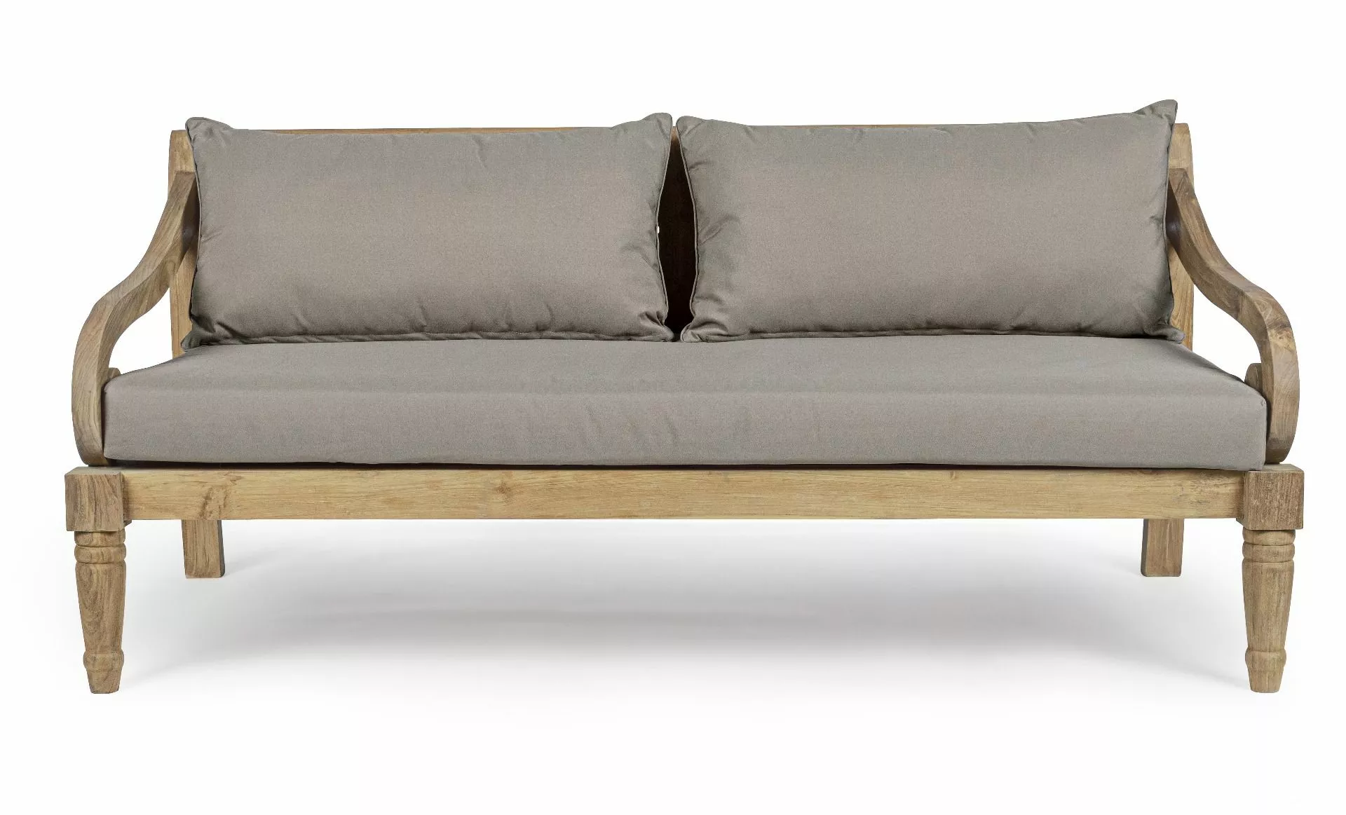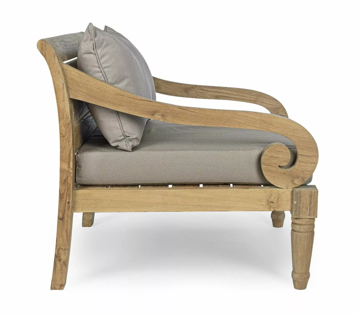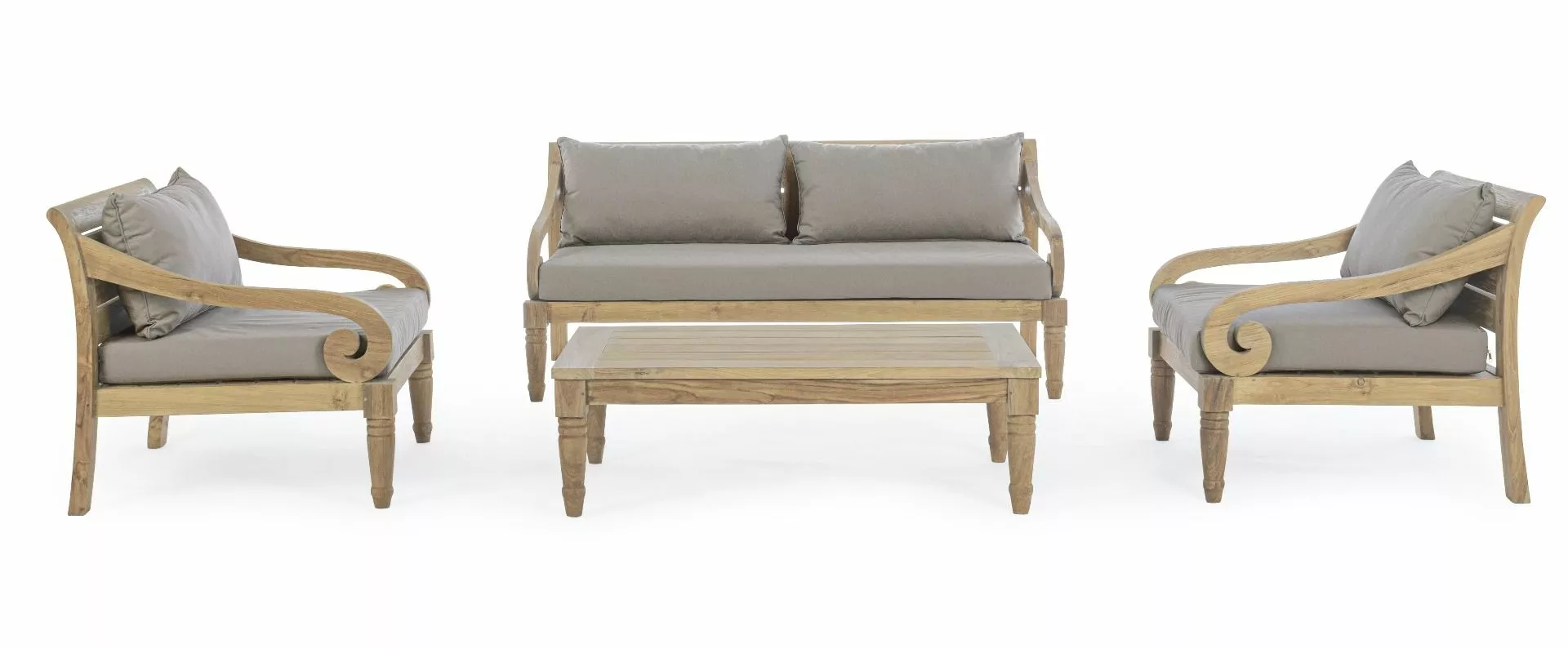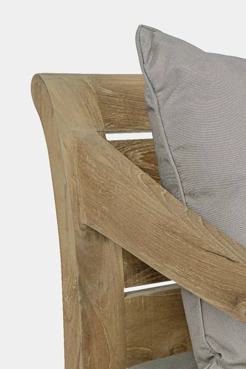 Fsc teak tre 100%, naturlig rustikk etterbehandling. puter med avtakbart trekk med soltett olefinstoff (100% polypropylen). Det anbefales at du ikke utsetter varen for direkte sollys og dårlig vær. Merk: denne originale produksjonen inkluderer treinnlegg av samme art. noen splittelser, sprekker eller ufullkommenheter, som også kan generere over tid, er trekk ved dette materialet og gjør hvert stykke unikt og originalt.