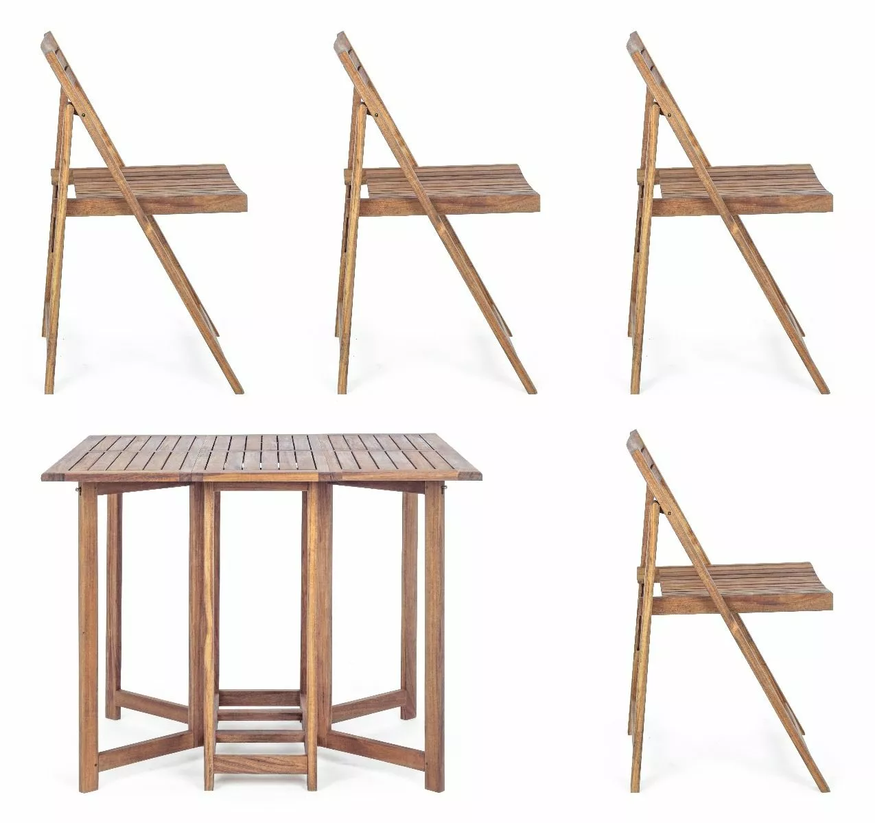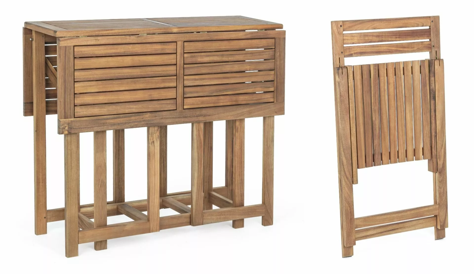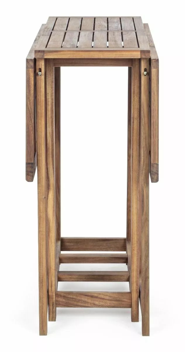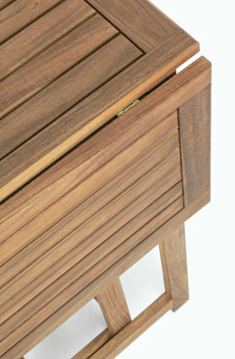 Acacia tre, overflatebehandling, galvaniserte stålskruer. sammenleggbar. Bordet har foldbare plater på begge sider.
