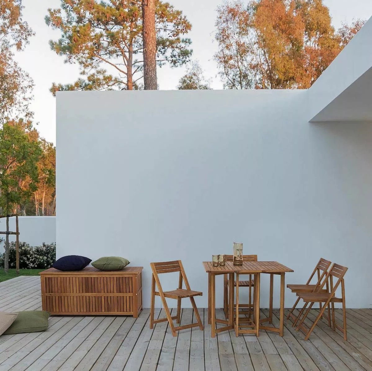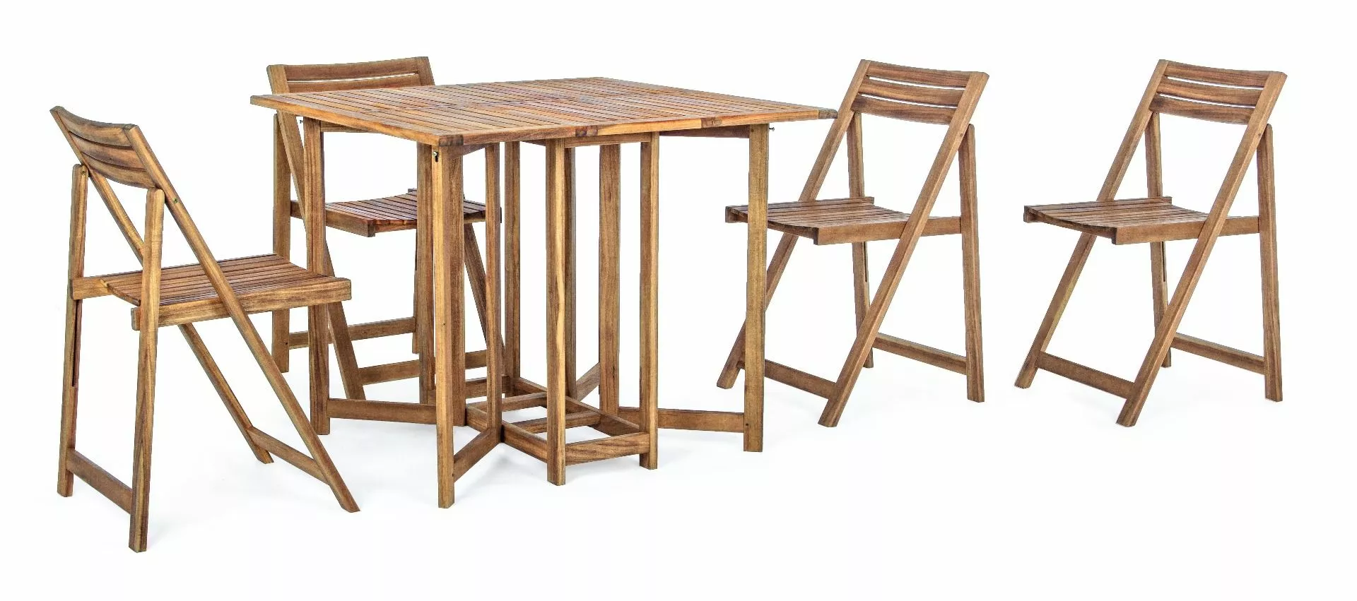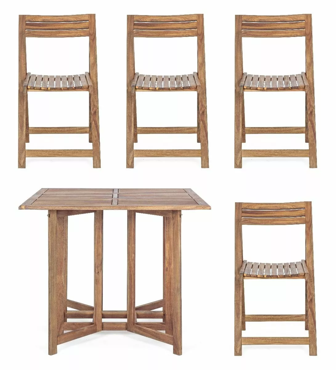 Acacia tre, overflatebehandling, galvaniserte stålskruer. sammenleggbar. Bordet har foldbare plater på begge sider.