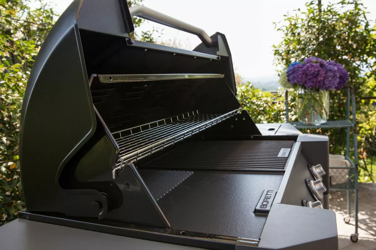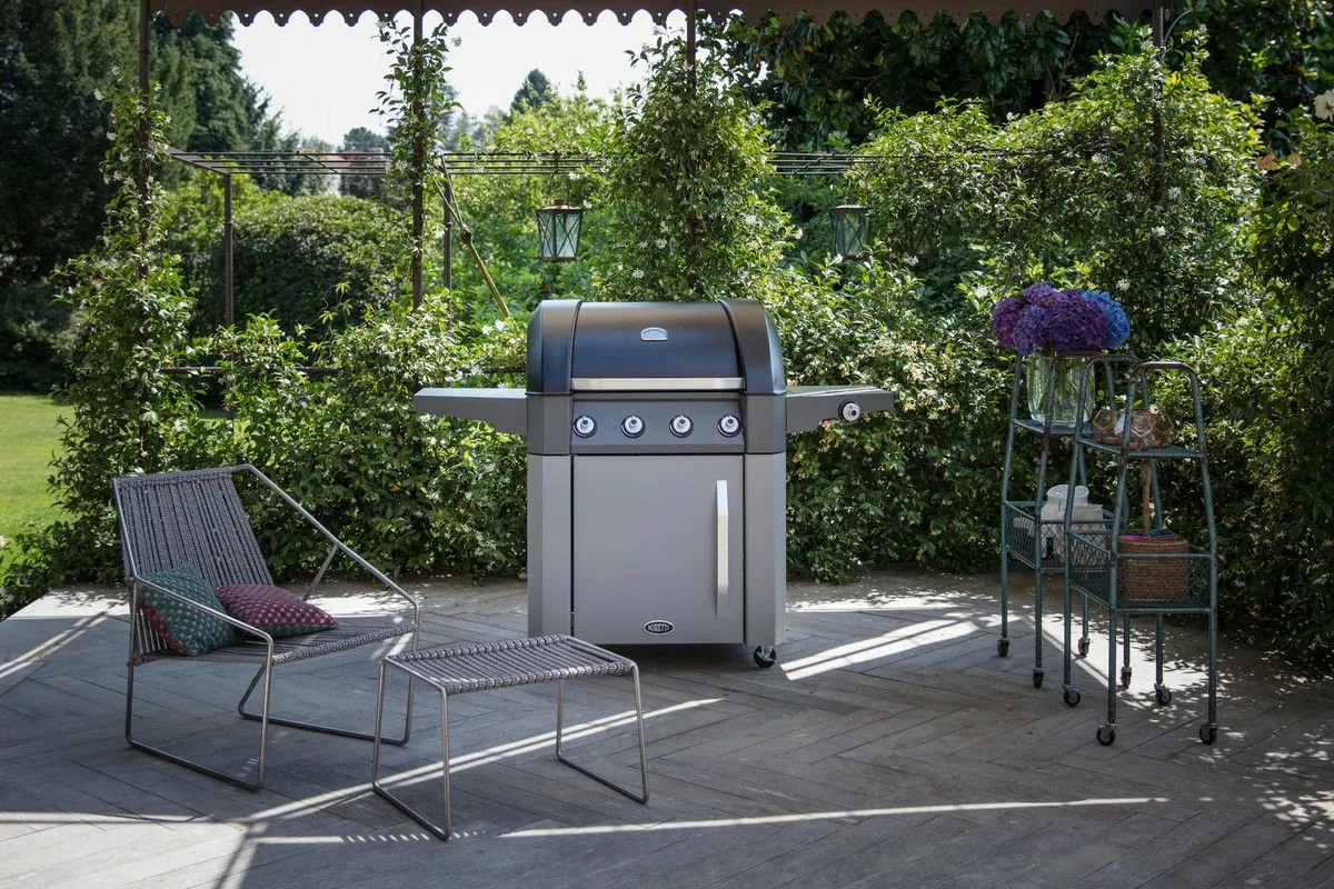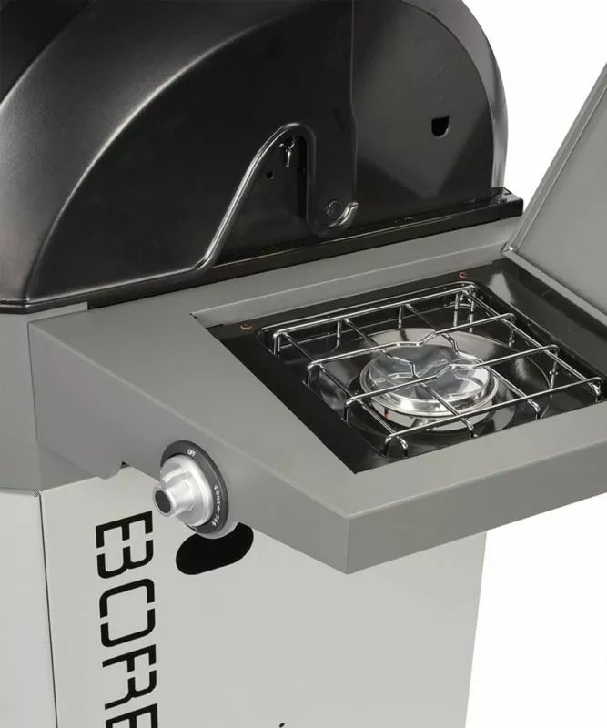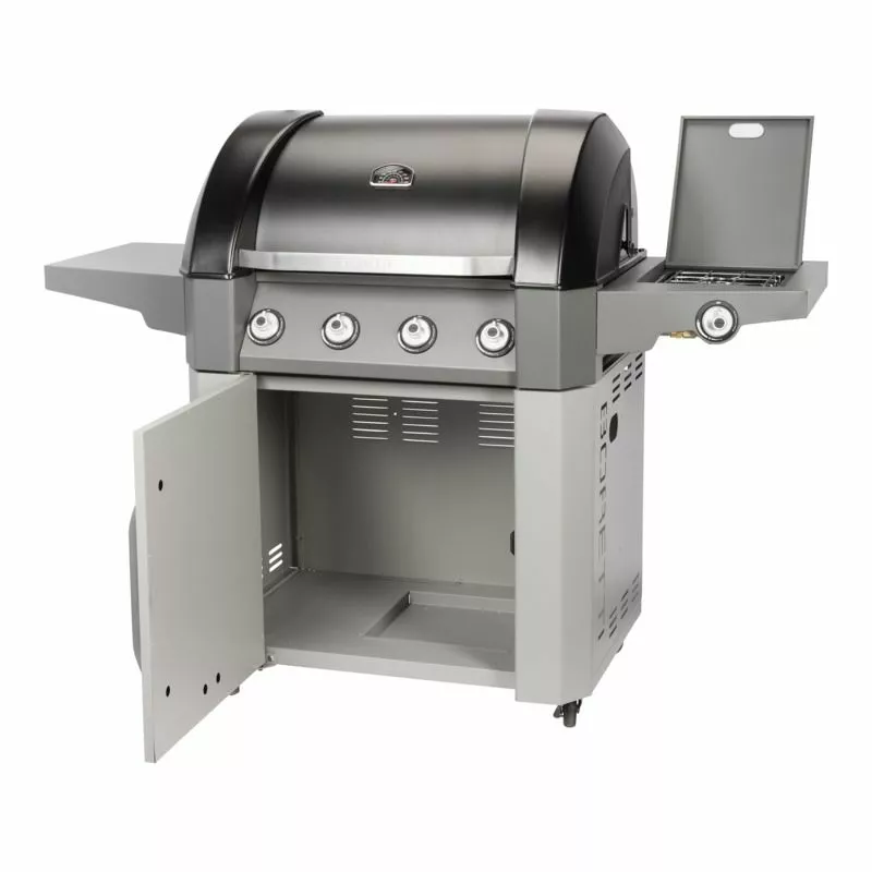 Grillen har inte mindre än fyra huvudbrännare och en sidobrännare för att tillaga såser eller soppa. Och tack vare grillgallren i gjutjärn får du de bästa grillresultaten. Gasflaskan kan förvaras under grillen så att den inte tar plats i trädgården eller förrådet. De två stora sidoborden ger gott om plats för råvaror och rätter.