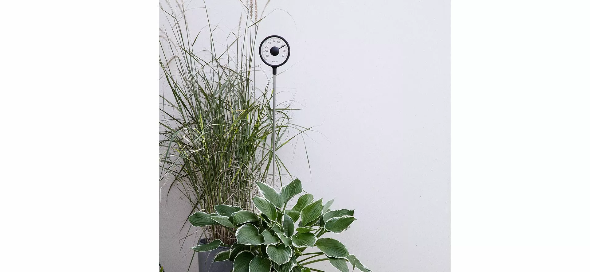 Utetermometer med spjut till trädgården eller blomkrukan på balkongen, så kan du alltid ha överblick över hur varmt det är. Termometern är lätt att läsa av och kan enkelt flyttas till den plats där du vill veta vad temperaturen är. Rengör med en urvriden trasa. Tillverkad av rostfritt stål, plast och gummi. Mått: Ø: 11 x D: 3 cm / Spjut H: 90 cm.