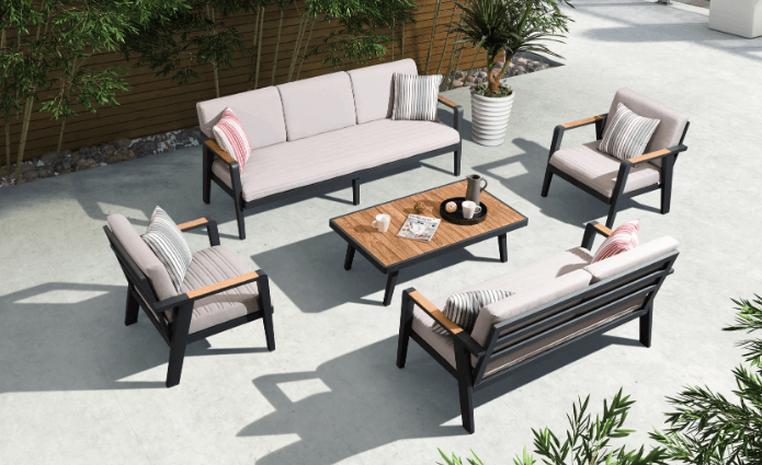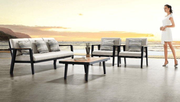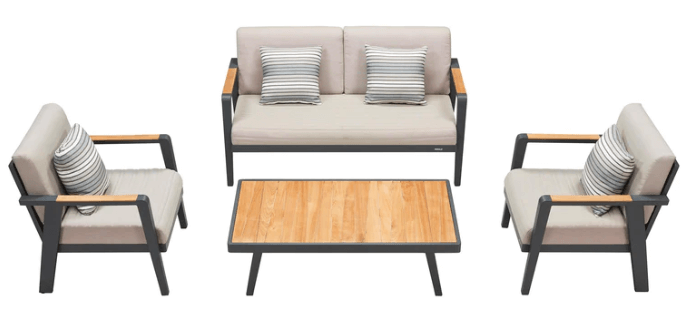 Emoti Hagegruppe bestående av en 2-seters sofa, 2 lounge-stoler og et salongbord er en moderne utendørsmøbelserie fra Higold i nordisk design. Med romslige stoler og sofa som gir svært god sittekomfort, er Emoti konstruert for å tåle vårt nordiske klima med kraftig konstruksjon og slitesterke materialer. Emoti-serien har en aluminiumsramme av høy kvalitet med Akzonobel pulverlakkering og FSC-sertifisert teak, og putene er laget av værbestandig Olefin-stoff som kan vaskes i maskin på 30 grader. Med høykvalitets skum som gir en meget god sittekomfort og lang levetid, er Emoti også UV-bestandig, vannavstøtende og fargebestandig. Vi gjør oppmerksom på at putene er vannavstøtende og drenerer godt, men ikke vanntette, så det anbefales å bruke trekk for å beskytte dem når det er nødvendig.