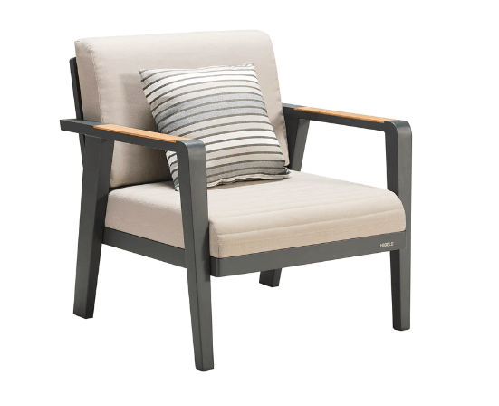 Emoti Lounge stol fra Higold er en stilfull og moderne serie med nordisk design som vil imponere på enhver uteplass. Den er spesielt konstruert for vårt nordiske klima og bruker kun de beste råmaterialene for å gi en lang levetid. Stolene og sofaen i serien er romslige og gir en svært behagelig sittekomfort. De er konstruert med en kraftig aluminiumsramme av høy kvalitet og pulverlakkert med Akzonobel. FSC-sertifisert teak brukes også i konstruksjonen. Emoti-serien har puter i værbestandig Olefin-stoff som kan vaskes i maskin på 30 grader. Putene er vannavstøtende og har god drenering, men anbefales å beskytte med et trekk ved behov. Høykvalitets skum brukes i putene for å gi en behagelig sittekomfort og sikre lang levetid. Emoti-serien er også UV-bestandig, vannavstøtende og fargebestandig. Anvisning for vasking av putetrekket er angitt på innsiden av putene.