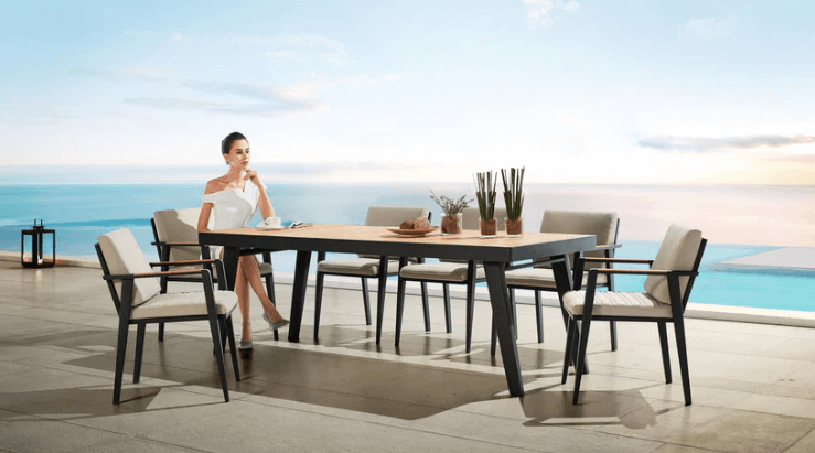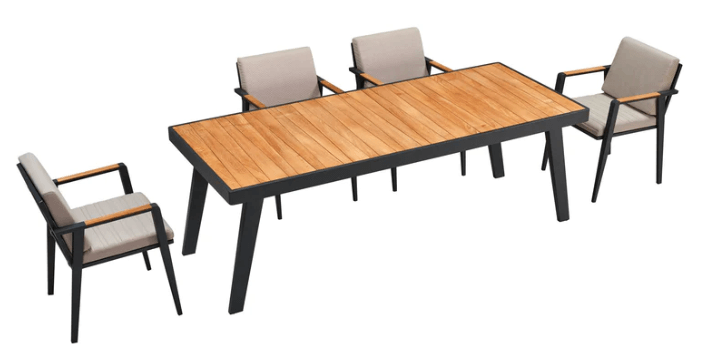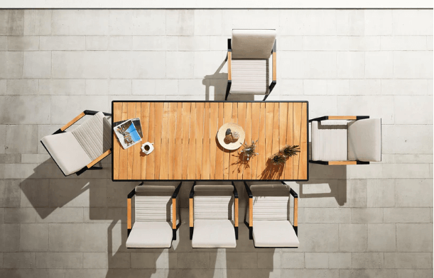 Bordets høyde og bein er justert slik at alle får god benplass og en behagelig opplevelse rundt spisegruppen. Stolene og bordplaten har detaljer i teak, som er av klasse A og FSC-sertifisert.