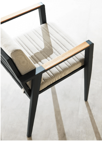 Med Emoti-spisegruppen får du ikke bare et stilrent møbel, men også en trendsetter med fokus på kvalitet. Rammen er laget av kraftig aluminium med en pulverlakkering i antrasittsort fra Akzonobel. Putene er fylt med høykvalitets skum og har et vannfast innertrekk for rask drenering. Trekkene er i Olefin stoff, som er spesielt værbestandig for det nordiske klimaet. Putene er også UV-bestandige, vannavvisende og fargebestandige, men de er ikke vanntette, så vi anbefaler å bruke møbeltrekk for ekstra beskyttelse. Hver putetrekk har en anvisning festet til seg, og kan vaskes i maskin på 30 grader etter behov.
