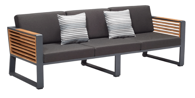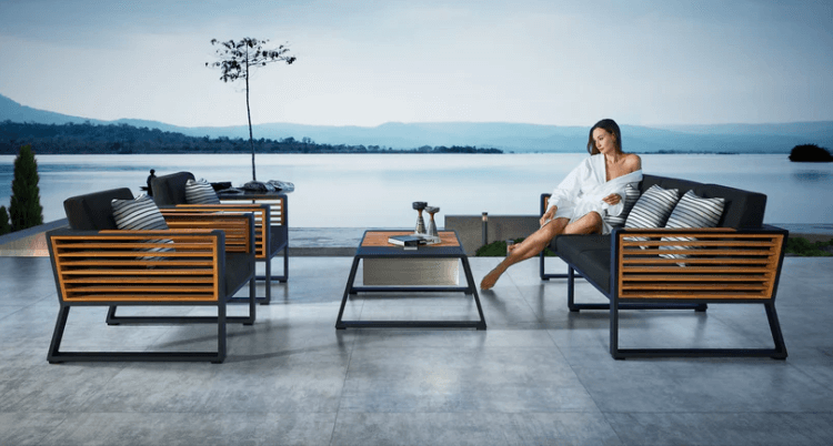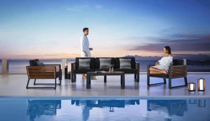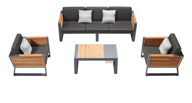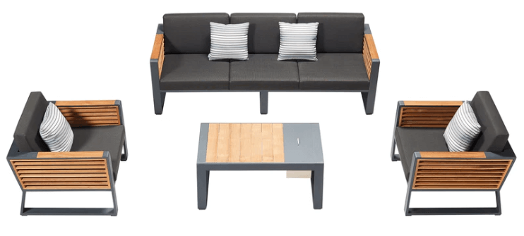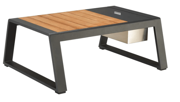 Teakdetaljene i New York-serien er unike, og sidepanelene er håndlaget med teakmaterialer i klasse A, og er FSC-sertifisert. Bordet som følger med, er også en del av møbelsettet, og har en stilig lukedesign med en rustfri stålbeholder som kan brukes til is eller oppbevaring. Lokket på bordet kan tas av eller snus for en jevn overflate.