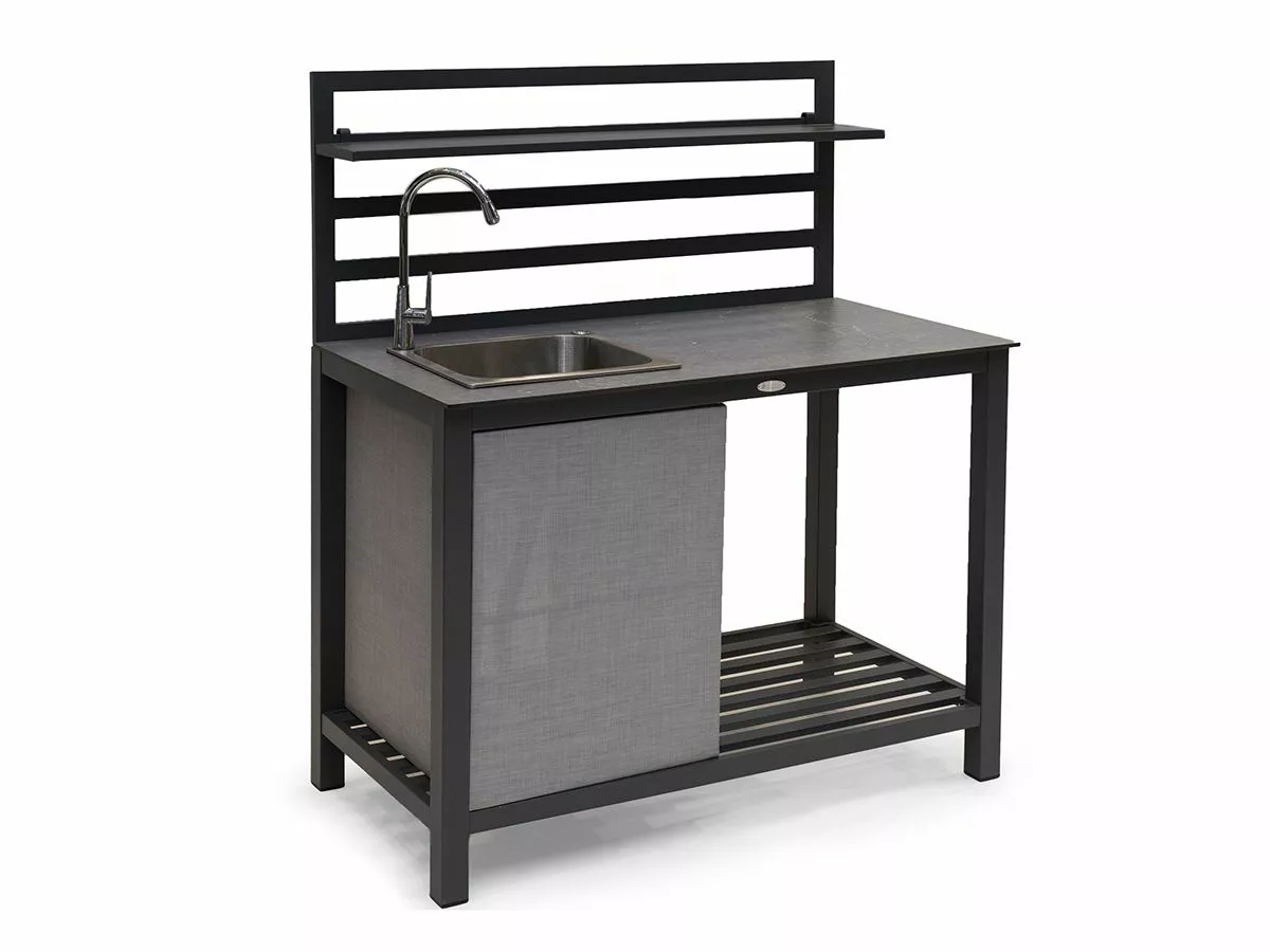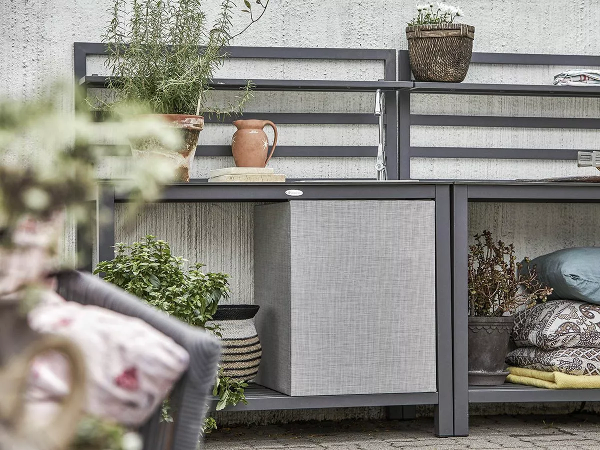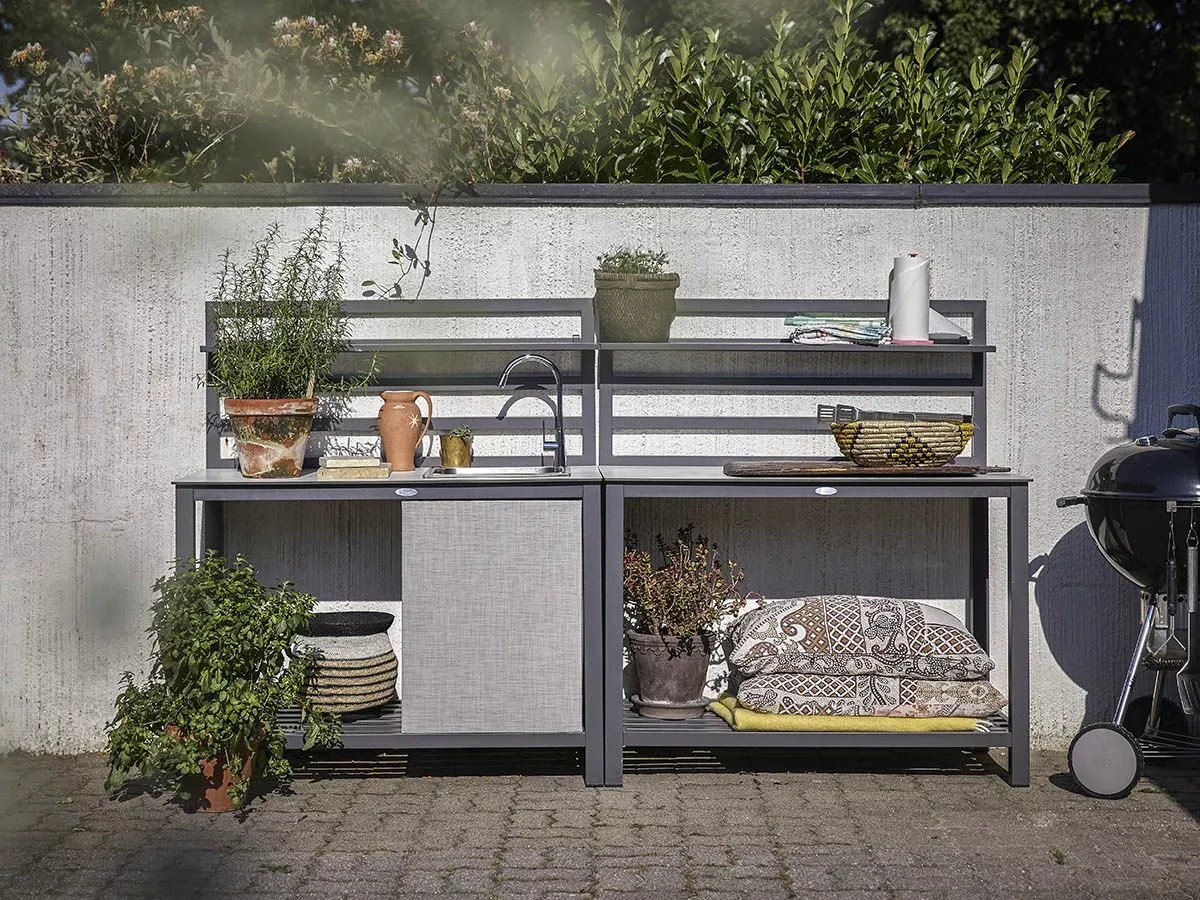 Alle ønsker vel å lage mat under åpen himmel? Sommerens must-have og selvfølgelige midtpunkt på fester er utekjøkkenet! Et komplett og stilrent utekjøkken med grå aluminiumsramme, grå hylle, gråmelert benkeplate, oppvaskkum og tekstilbeskyttelse.