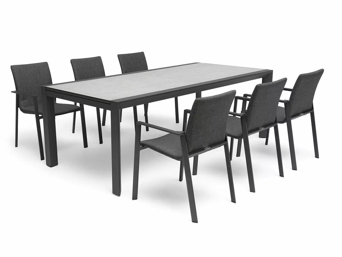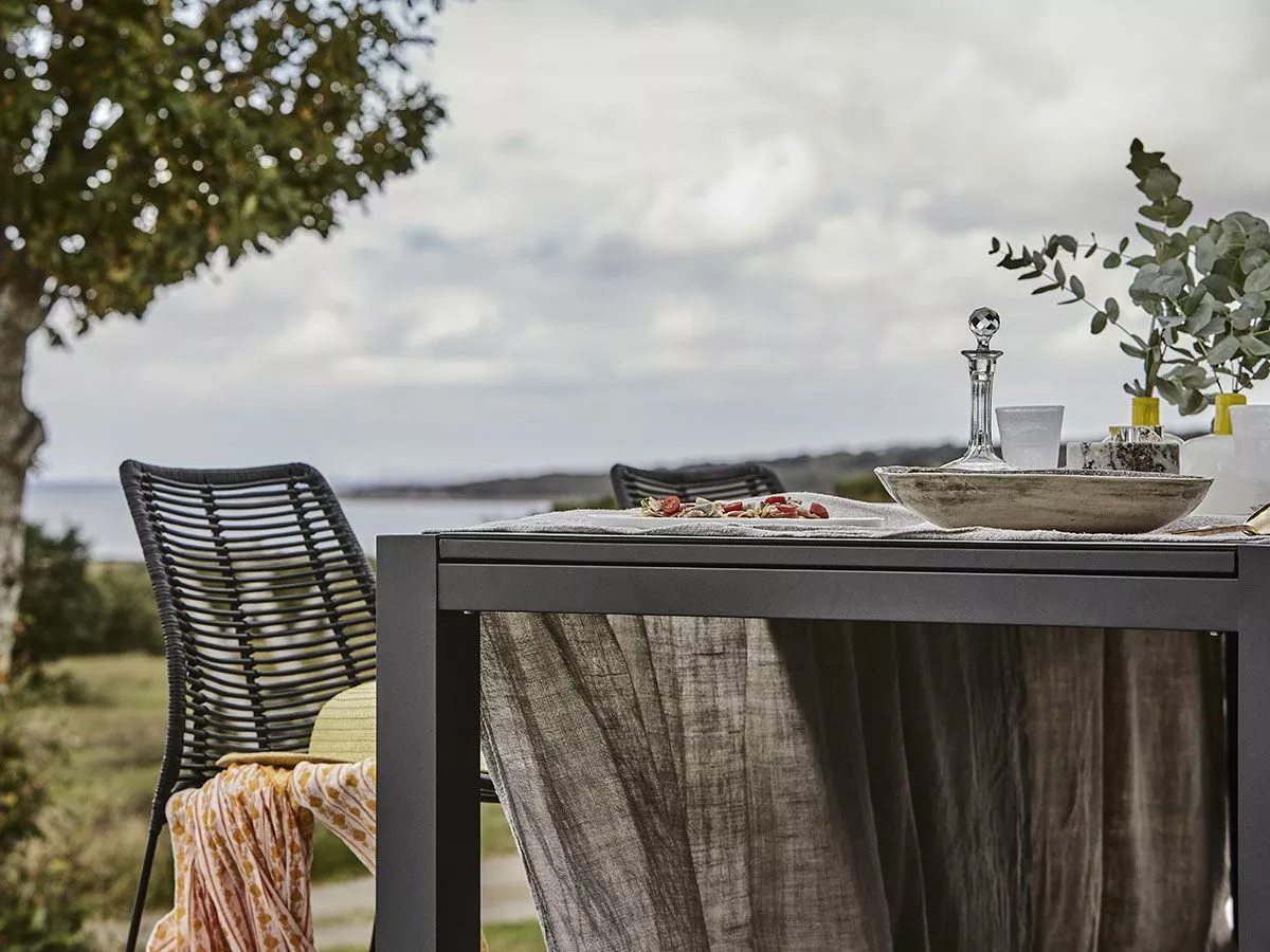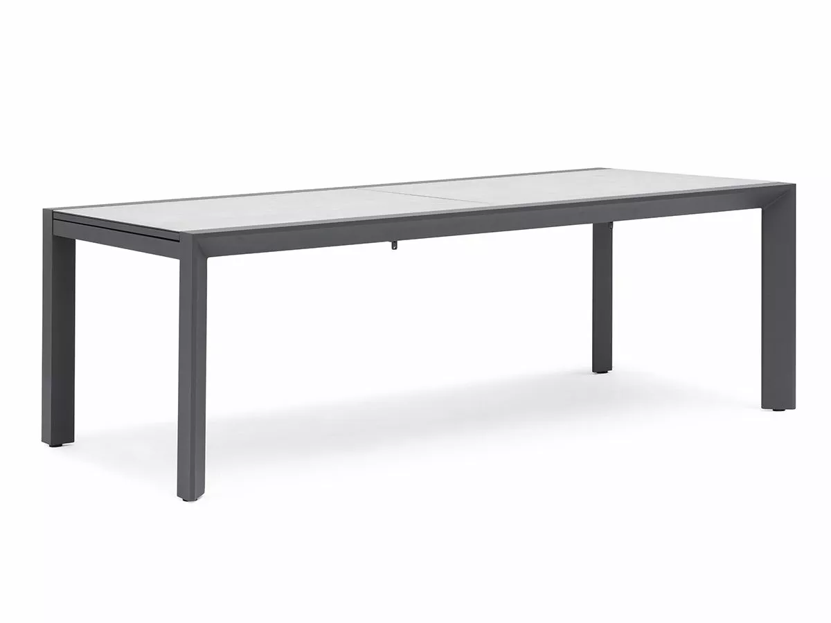 En praktiskt spisebord som måler 220 cm og kan enkelt forlenges til 340 cm med tilhørende uttrekkplate. Laget av aluminium. Farge: kullgrå. Bordplate av keramisk glass.