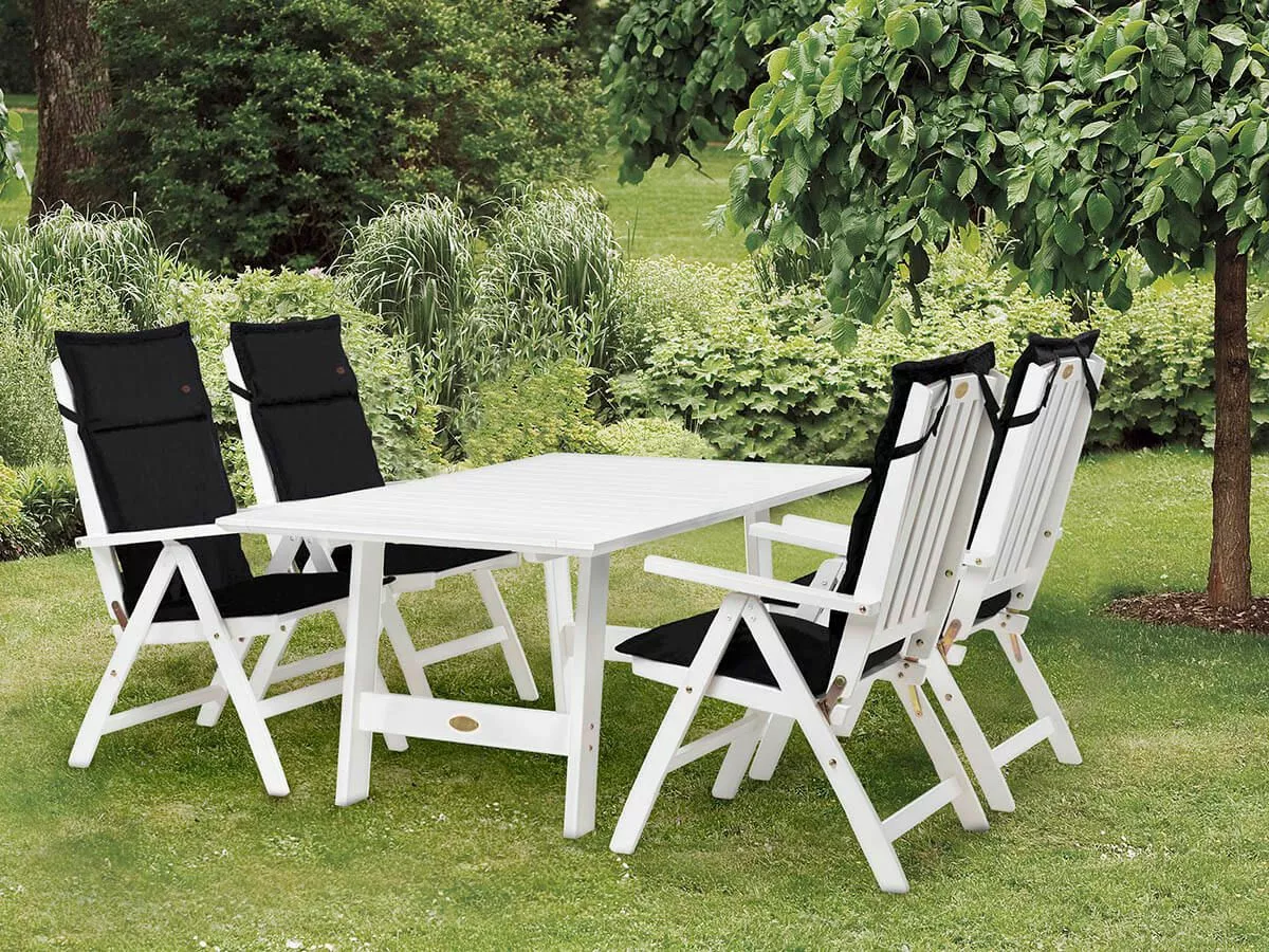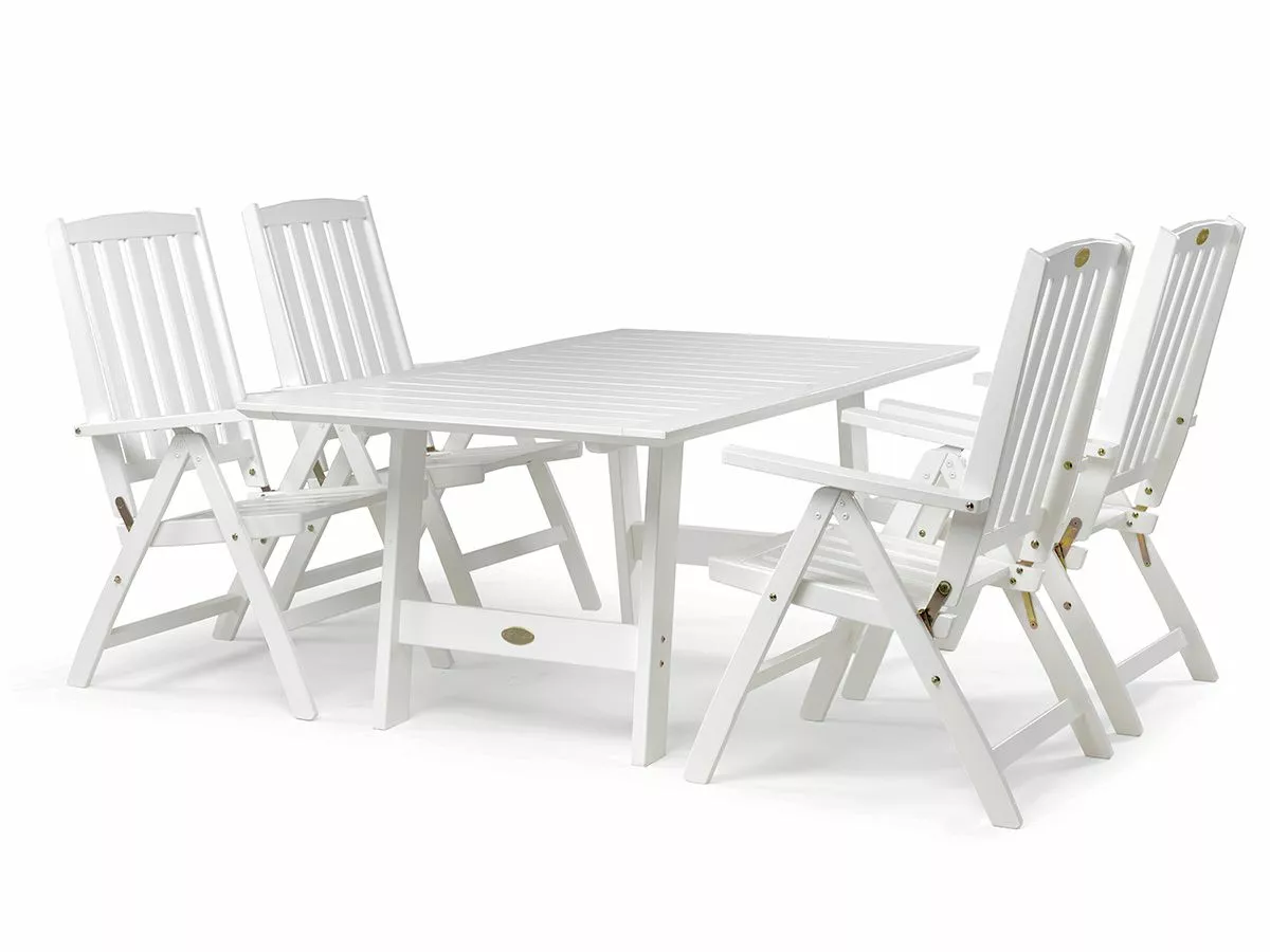 En klassisk spisegruppe i hvitmalt FSC®-sertifisert kjernefuru fra Norrland. Stolen er justerbar i forskjellige posisjoner og kan enkelt felles sammen for praktisk oppbevaring. Bordet er 165 cm langt og kan forlenges til 225 eller 285 cm hvis du legger til en eller to ileggsplater.