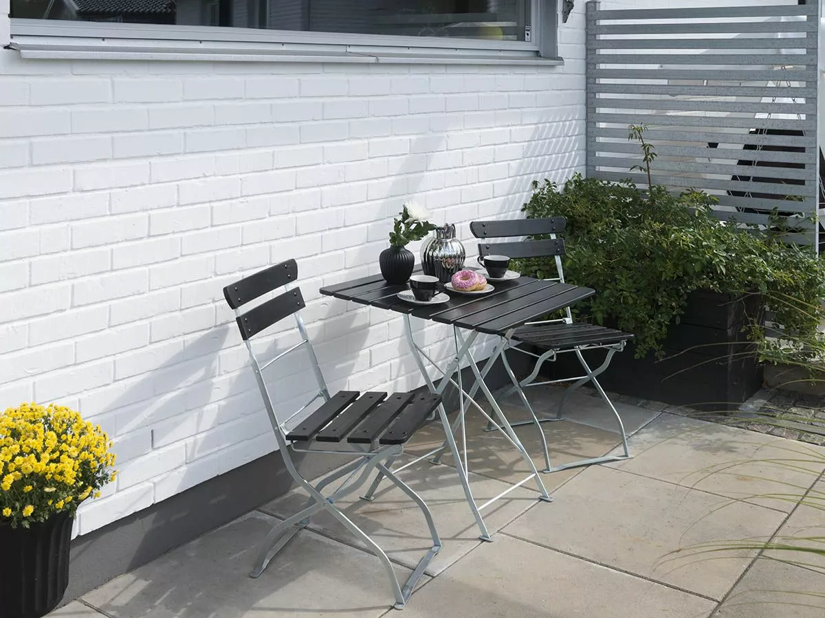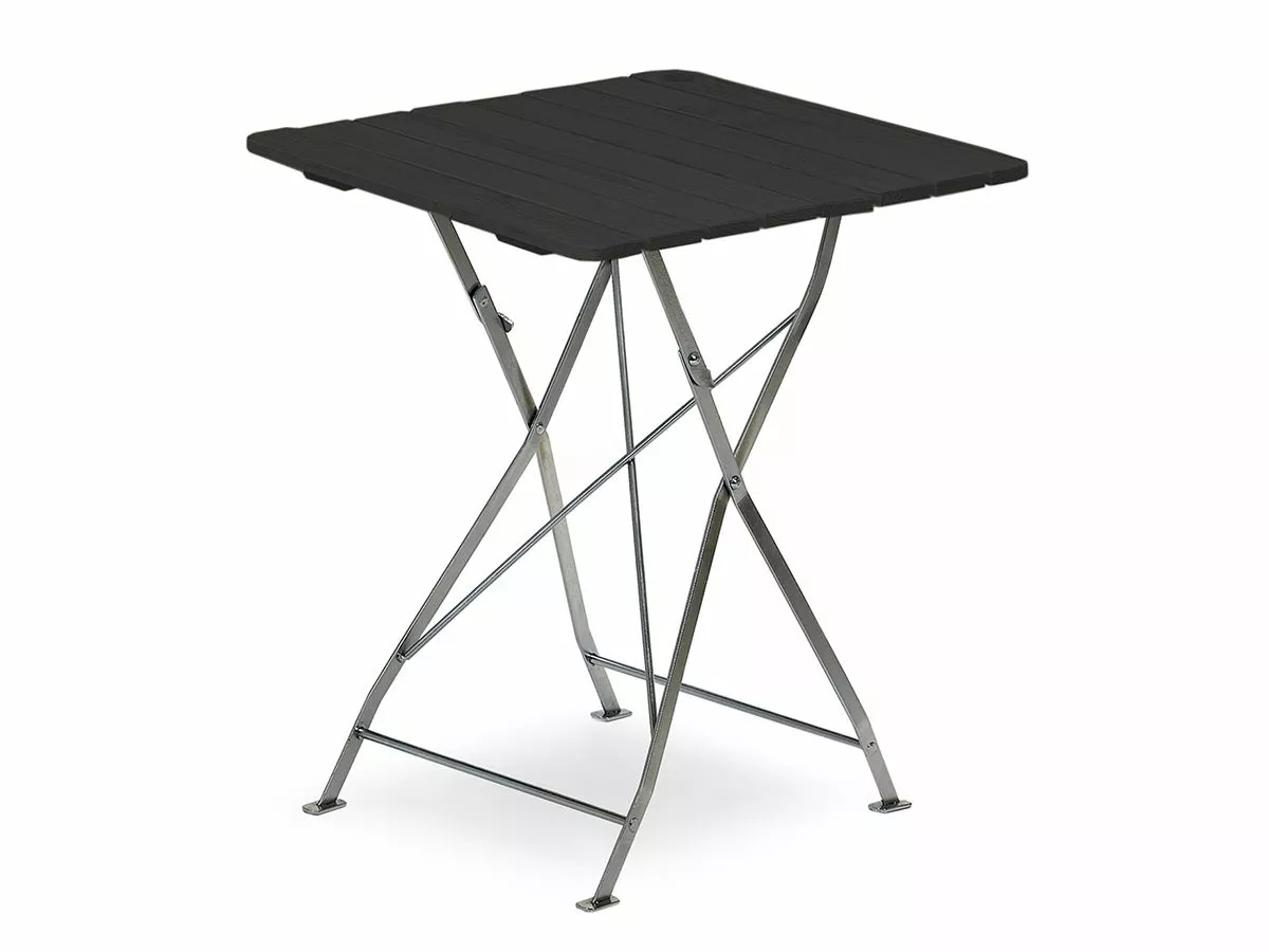 Cafebord med ramme av galvanisert stål, bordplate i svartlakkert tre. Kan foldes sammen for enklere oppbevaring.