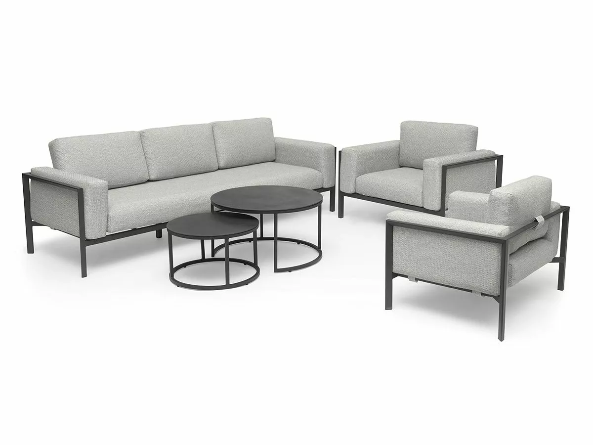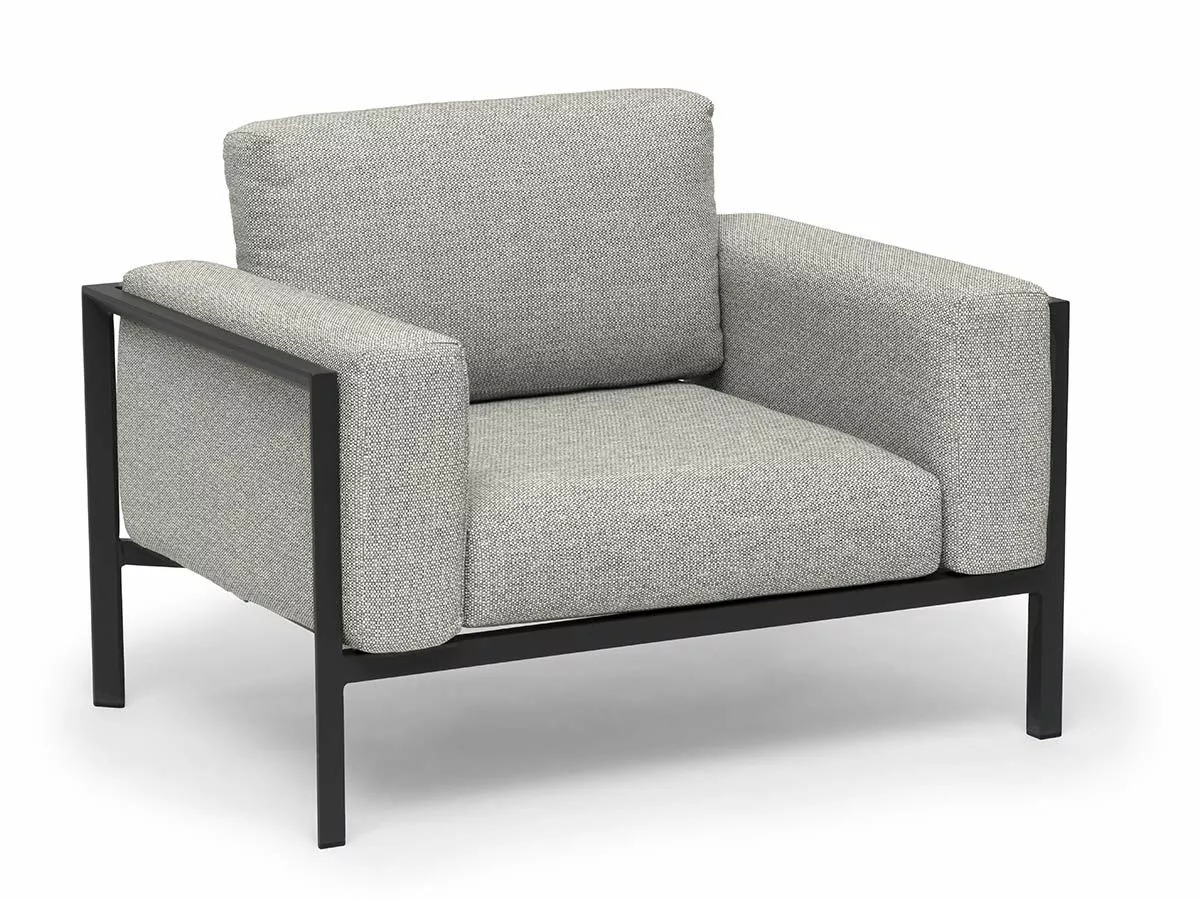 Moderne møbel med høykvalitetsputer som gir en følelse av å bringe innendørs ut. Laget av pulverlakkert aluminium i fargen kullgrå. Putene er i grå/beige fontelina i sunproof olefin, som er et værbestandig og UV-resistent premiumstoff. Putene har også quick dry foam i sitteflaten. Quick dry er et unikt fyllstoff med rask tørkeevne og god sittekomfort. Det er pustende, har åpen cellestruktur og er værbestandig, og fungerer derfor optimalt for utemøbler.