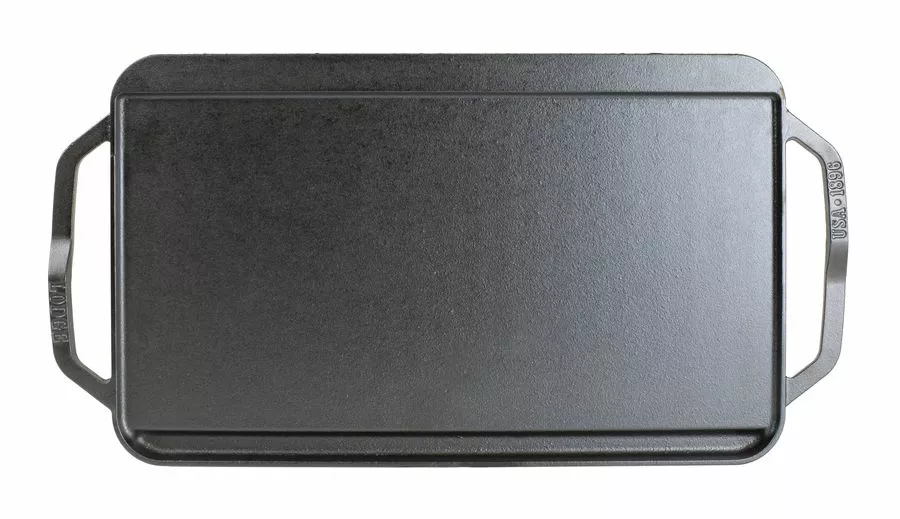 Denna vändbara grill/panna från Lodge Chef Collection ger utmärkt värmebevarande och distribution, och passar över två spishällar eller på grillen. Med en design inspirerad av kockar har denna grill/panna nya upphöjda handtag för ett ergonomiskt grepp och bättre kontroll, oavsett vilken sida du använder. Varje sida har också en droppbricka för att fånga upp fett, vilket håller maten mager och utsökt. Den stora hällen är utmärkt för pannkakor och ägg, grillad kyckling och nötkött.