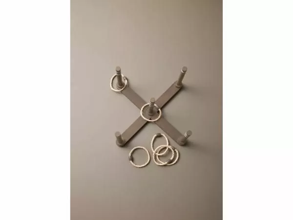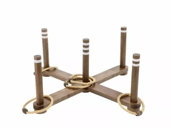 Du kan spille ringspill i hagen, ved hytta, på stranden eller under en hagefest. Spillet består av et stativ og fem ringer, og målet er å oppnå flest mulig poeng ved å kaste ringene slik at de lander rundt pinnene på stativet. Spillet leveres med spilleregler på både dansk og engelsk og en stilig stoffpose for transport og oppbevaring av spillet. Spillet leveres flatpakket, og delene er laget av solid og vakkert beiset gummitre som gir en flott og naturlig stil, ettersom fargene og strukturene kan variere fra del til del. Det anbefales å tørke av delene med en fuktig klut etter bruk og oppbevare dem tørt og rent for å øke holdbarheten og spillegleden.
