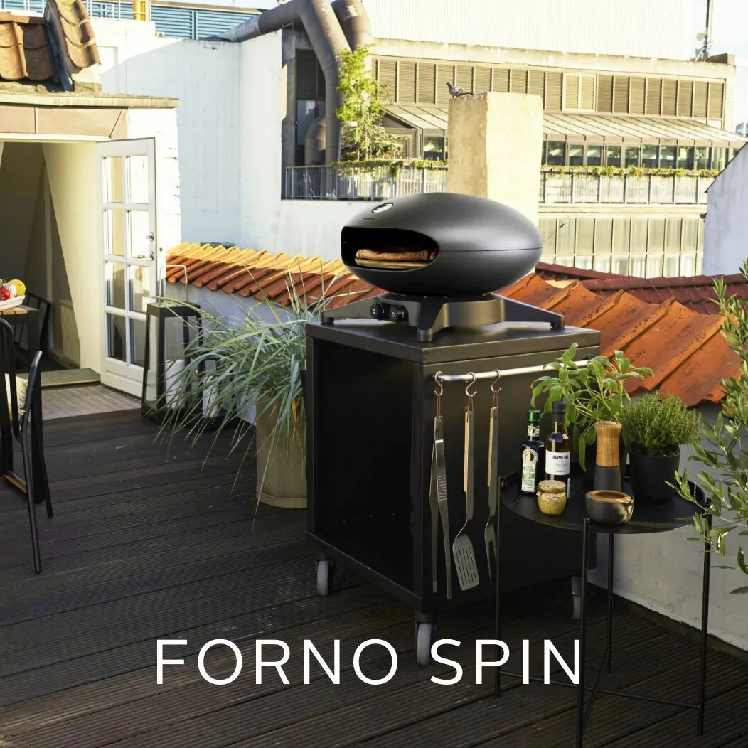 Morsø Forno Spin er en pizzaovn som drives av gass og har en unik funksjon i form av en elektrisk roterende pizzastein som sikrer et jevnt og fristende resultat. Denne pizzaovnen er et uvurderlig tillegg til enhver utendørs matlagingsopplevelse og er svært brukervennlig. Med sin brede åpning gir ovnen god plass til en 40 cm i diameter pizzastein. Morsø Forno Spin er 35 cm høy og har en dybde og bredde på 57 cm med én brenner. Vekt er 17kg. Designet er av Klaus Rath.