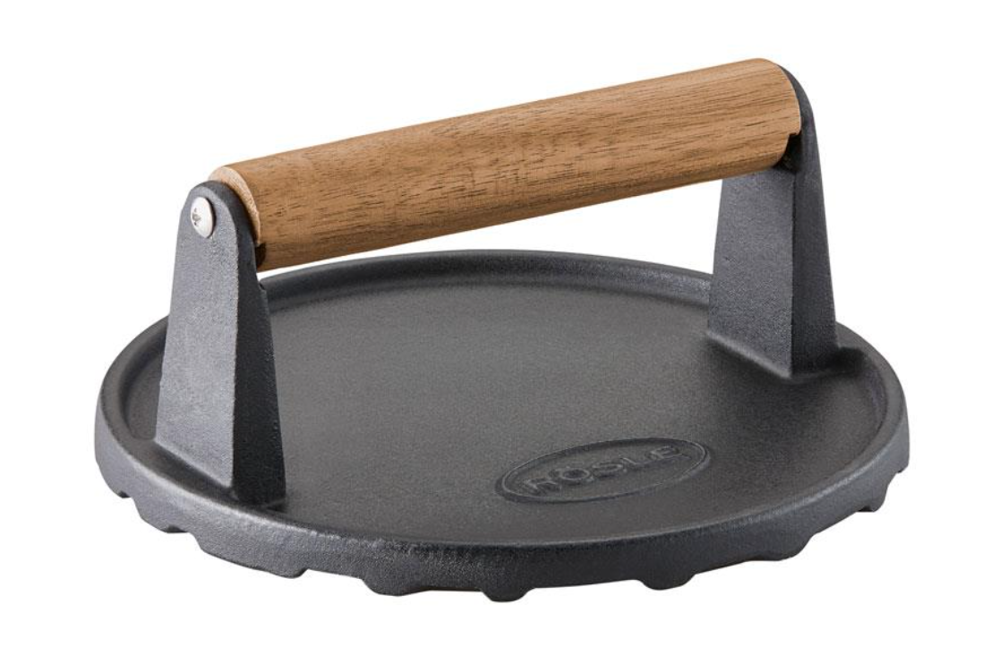 Grillpress i gjutjärn med handtag i valnöt. Grillpressen värms på grillen, sedan lägger du i maten som ska tillagas. Passar mycket bra för att grilla hamburgare, men även olika kött som bara ska tillagas en kort stund.