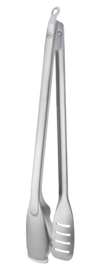 Grilltång på 44 cm med stor yta. Ena sidan av tången är hel, medan den andra har hål i ytan för att frigöra fett från kött och fisk. Grilltången är gjord av stål.
