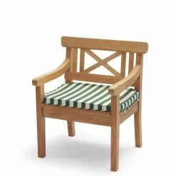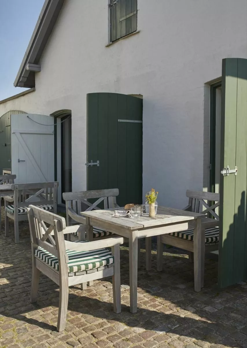 For å feire Drachmann-benkens 40-årsjubileum har vi oppgradert putene med fargerike striper for å gi den klassiske benken et nytt uttrykk. Drachmann-puter er skreddersydde for å passe til kolleksjonen og svært værbestandige. Møbelstoffene er Oeko-Tex-sertifisert, farge- og lysbestandig, vann- og smussavvisende og til og med muggbestandig. Puten tørker eksepsjonelt raskt, selv etter et kraftig regnskyll, da skummet har en åpencellet struktur som lar vann og luft passere. Skummet gir en fast og behagelig tekstur som forblir den samme år etter år.