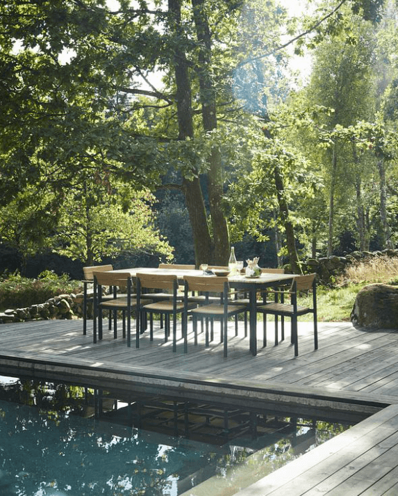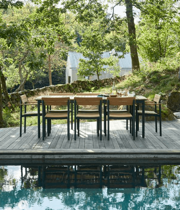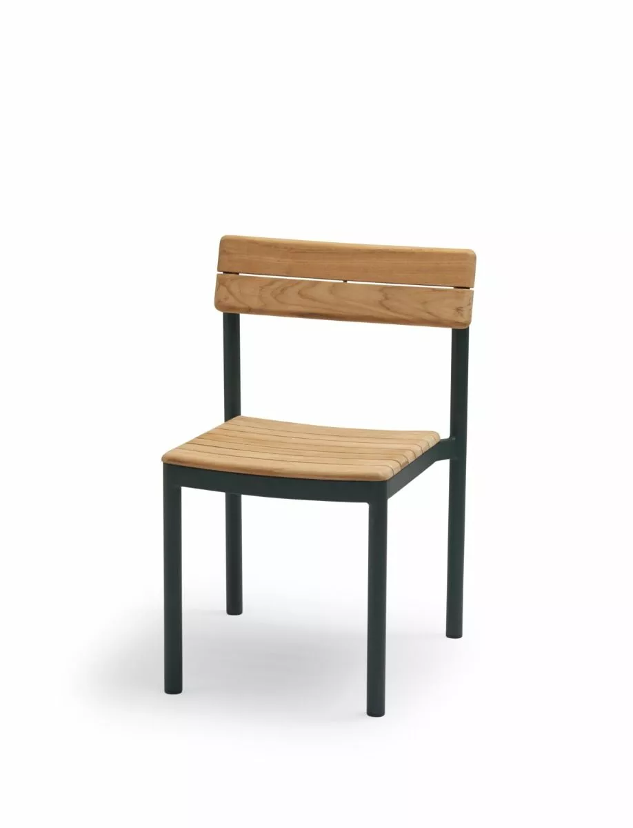 Pelago-kolleksjonen er en serie med et grasiøst moderne uttrykk. Pelago Chair er høy på komfort for lange middager rundt et bord. Med rygg og sete i teak og pulverlakkert aluminiumsramme gir stolen stor allsidighet, den er lett nok til å bevege seg lett og stable, men likevel solid. Stolens slanke profil passer til mange arkitektoniske sammenhenger.
