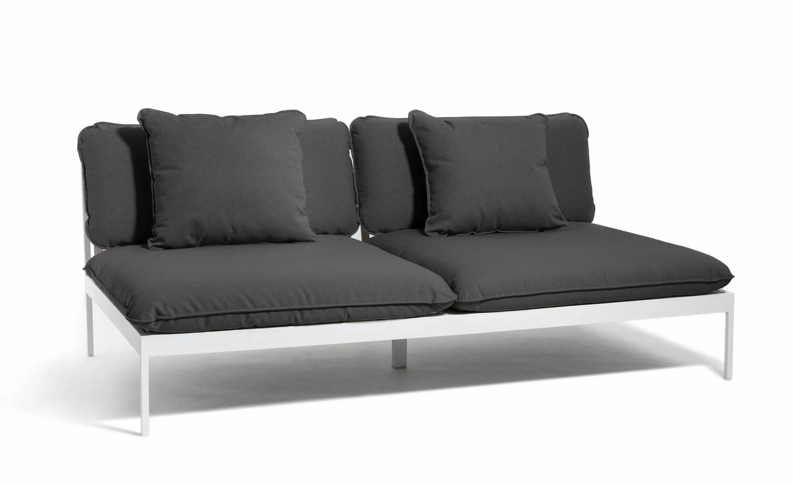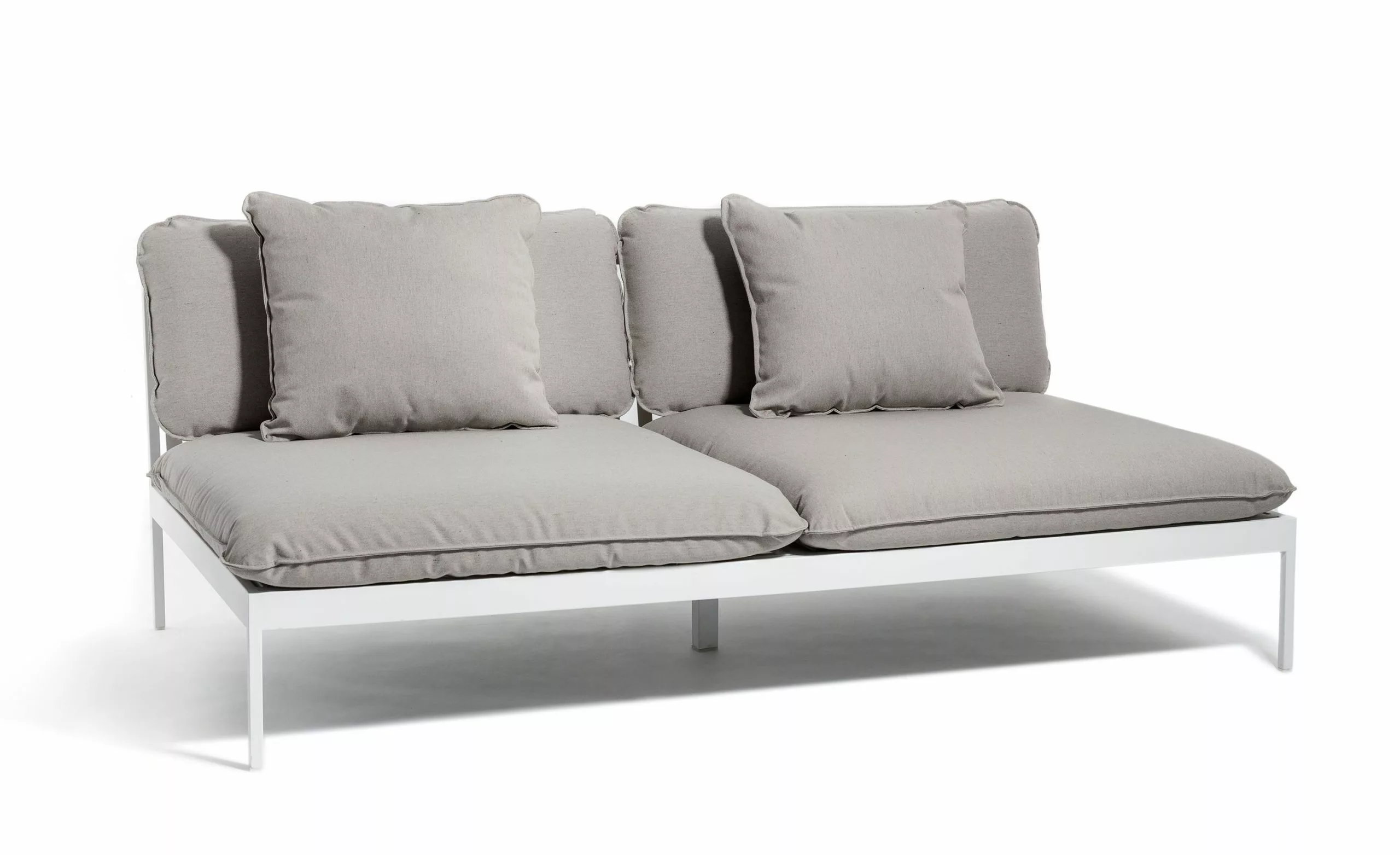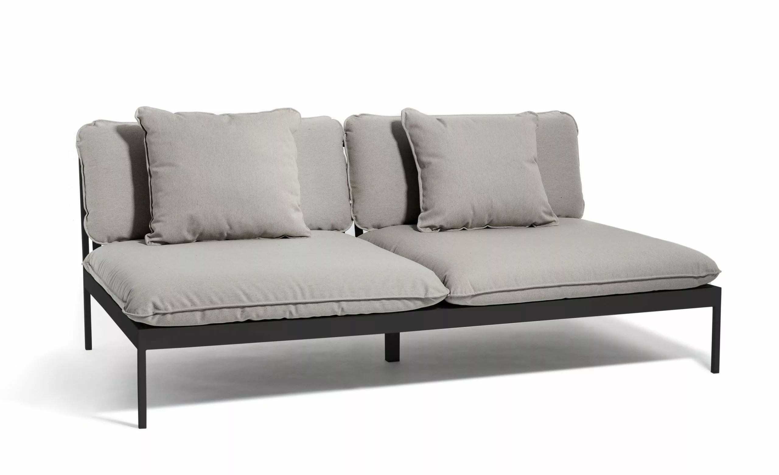 Ett smart modulärt soffsystem som kan användas året runt utomhus. Mycket mångsidig, mycket slitstark. Ramarna är gjorda av aluminium, kuddarna är gjorda av Sunbrella utomhustyger och fyllda med Quickdry-skum.