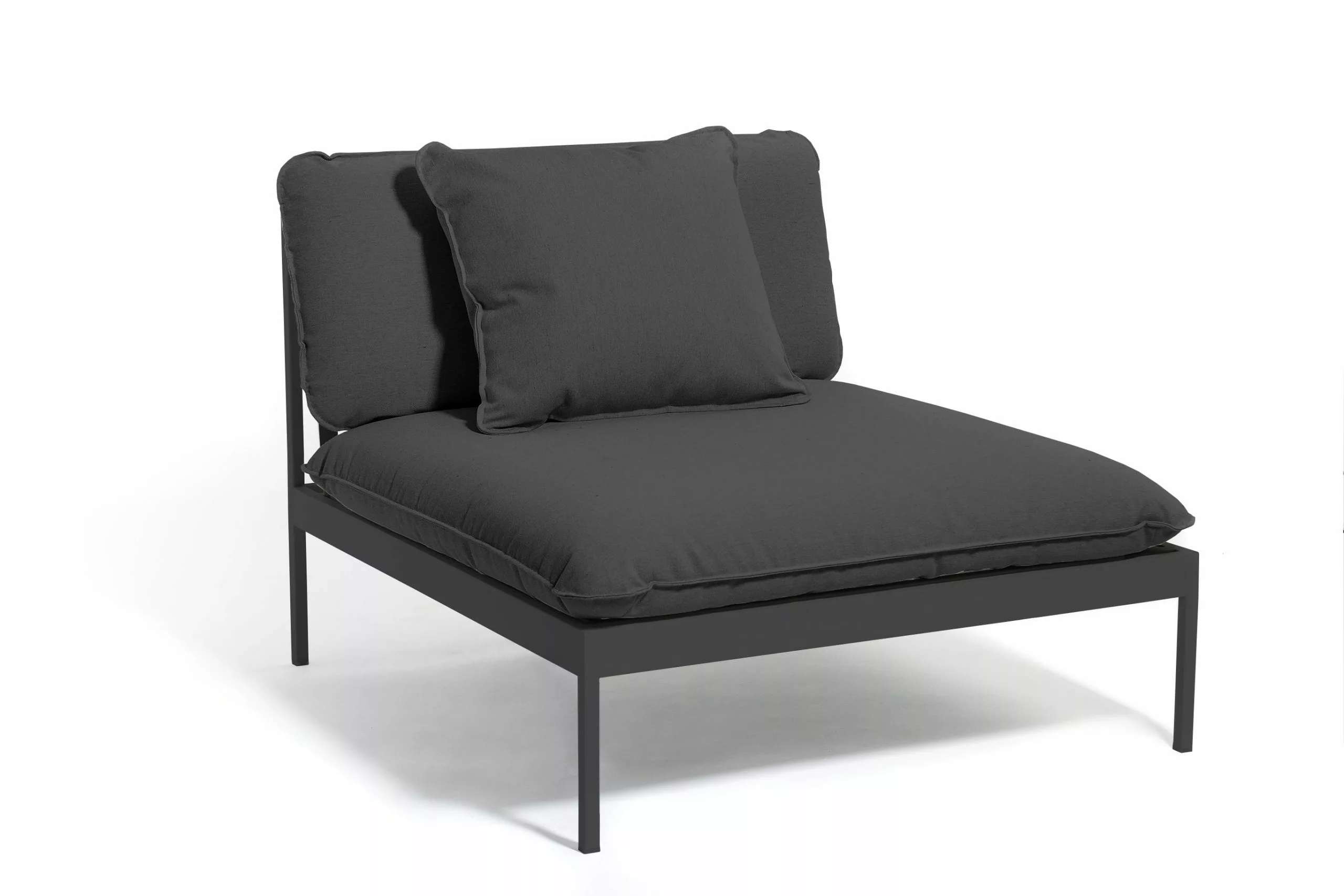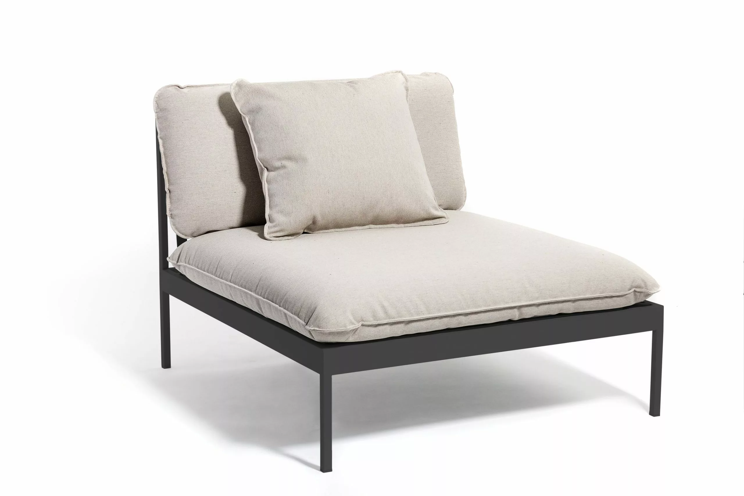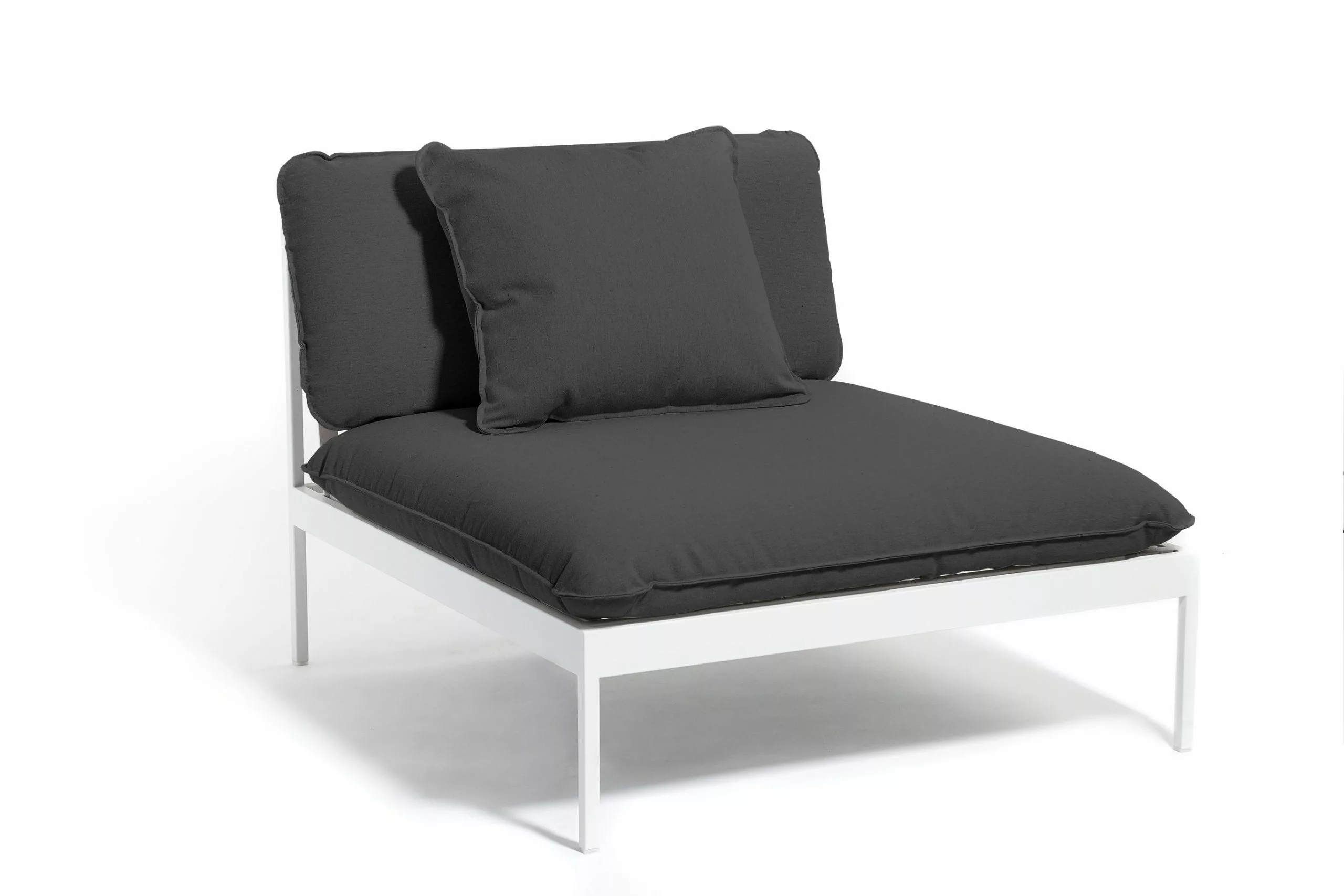 Ett smart modulärt soffsystem som kan användas året runt utomhus. Mycket mångsidig, mycket slitstark. Ramarna är gjorda av aluminium, kuddarna är gjorda av Sunbrella utomhustyger och fyllda med Quickdry-skum.