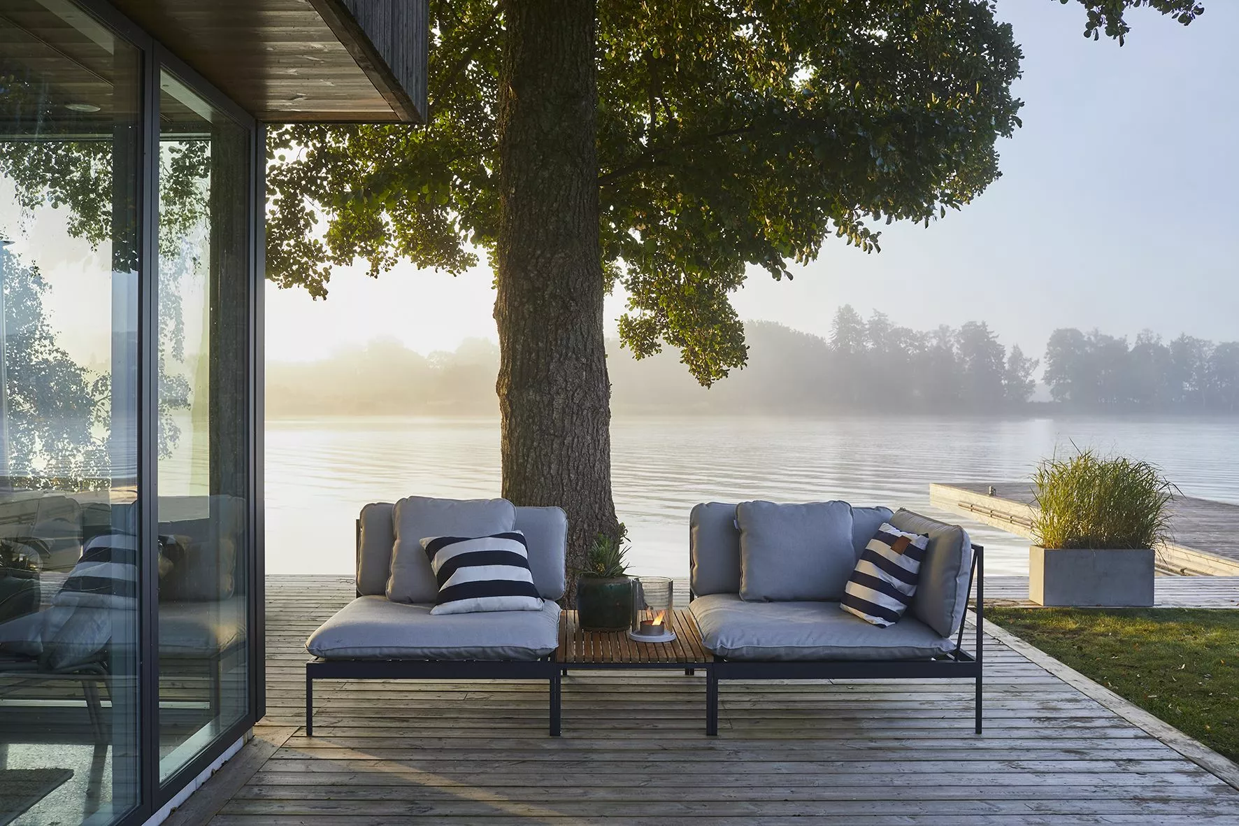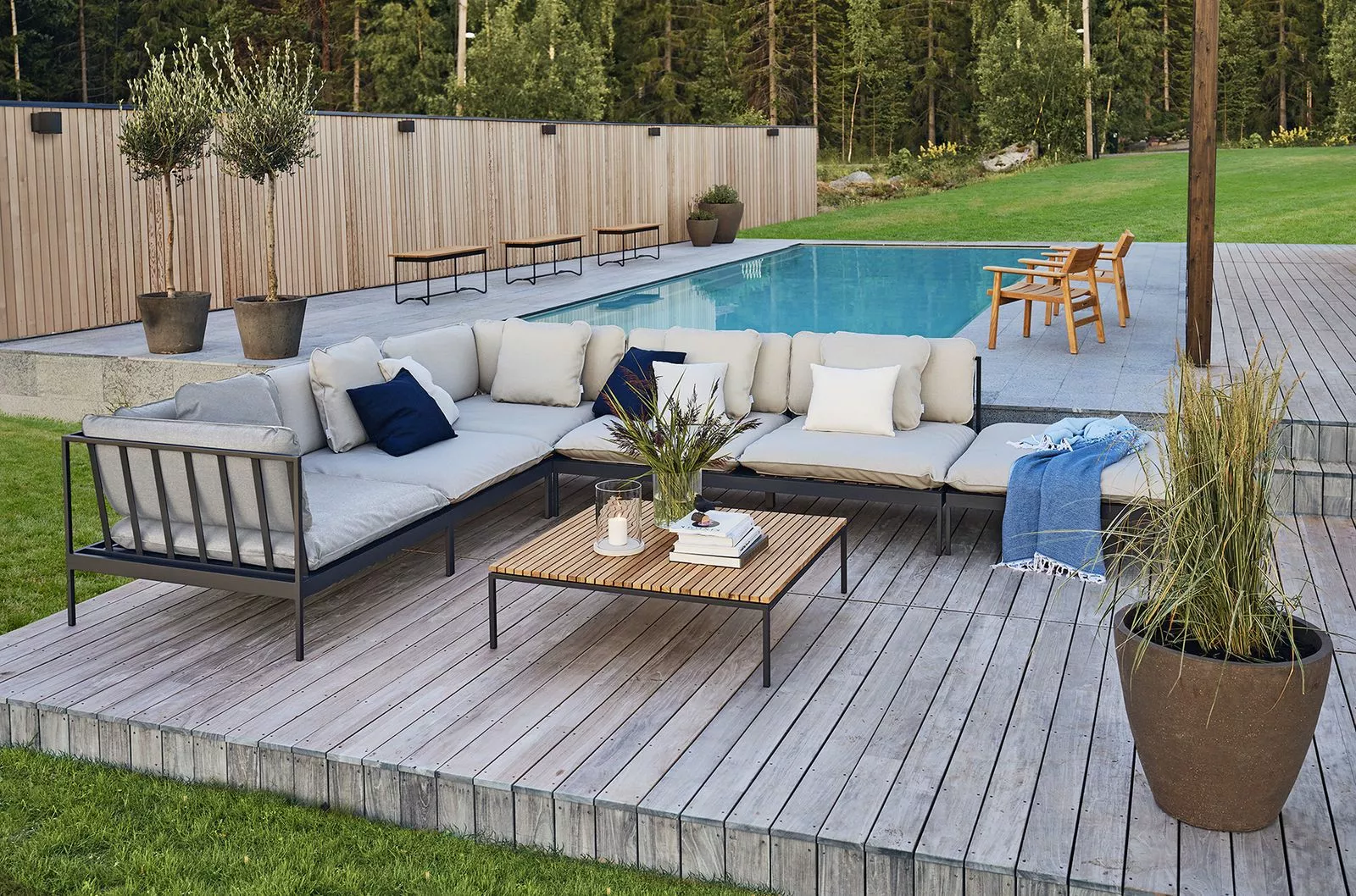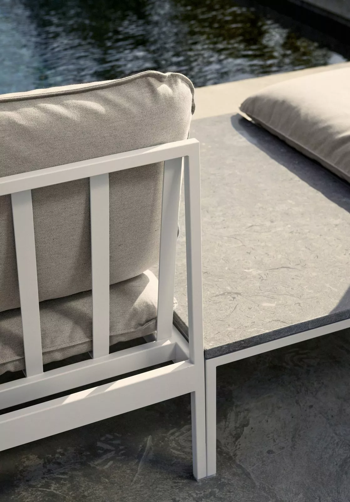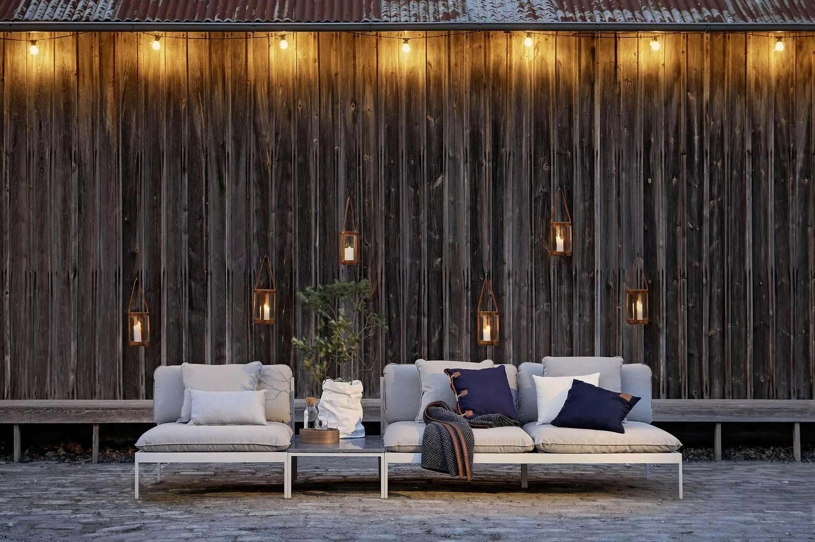 Ett smart modulärt soffsystem som kan användas året runt utomhus. Mycket mångsidig, mycket slitstark. Ramarna är gjorda av aluminium, kuddarna är gjorda av Sunbrella utomhustyger och fyllda med Quickdry-skum.